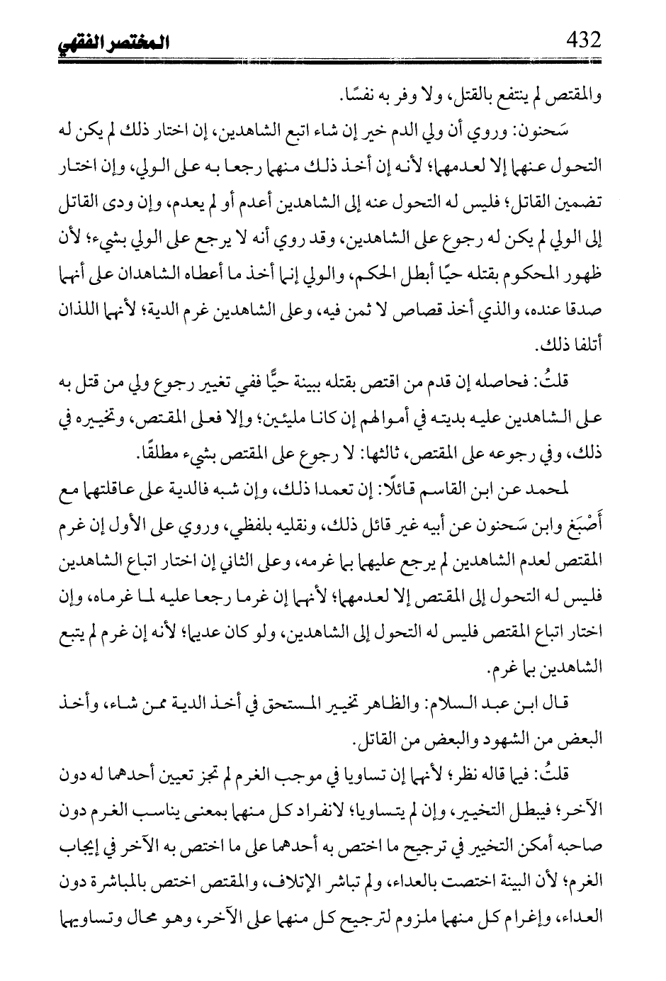 لمحمد عن ابن القاسم قائلاً: إن تعمدا ذلك، وإن شبه فالدية على عاقلتهما مع أصبغ وابن سحنون عن أبيه غير قائل ذلك، ونقليه بلفظي، وروي على الأول إن غرم المقتص لعدم الشاهدين لم يرجع عليهما بما غرمه، وعلى الثاني إن اختار إتباع الشاهدين فليس له التحول إل المقتص إلا لعدمهما؛ لأنهما إن غرما رجعا عليه لما غرماه، وإن اختار إتباع المقتص فليس له التحول إلى الشاهدين، ولو كان عديما؛ لأنه إن غرم لم يتبع الشاهدين بما غرم.