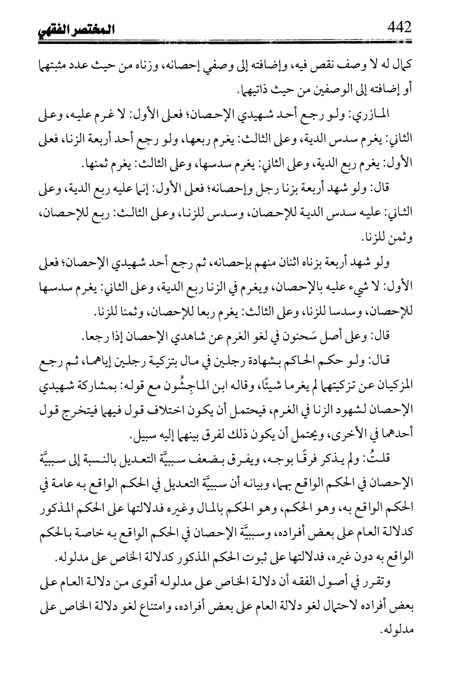 قلت: ولم يذكر فرقاً بوجه، ويفرق بضعف سببية التعديل بالنسبة إلى سببية الإحصان فى الحكم الواقع بهما، وبيانه أن سببية التعديل فى الحكم الواقع به عامة في الحكم الواقع به، وهو الحكم، وهو الحكم بالمال وغيره فدلالتها على الحكم المذكور كدلالة العام على بعض أفراده، وسببية الإحصان فى الحكم الواقع به خاصة بالحكم الواقع به دون غيره، فدلالتها على ثبةت الحكم المذكور كدلالة الخاص على مدلوله.