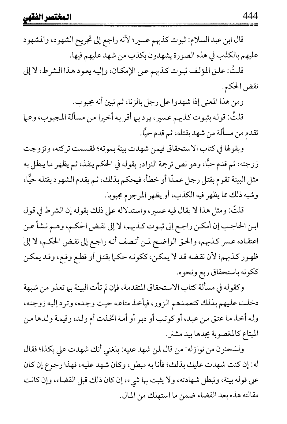 قلت: قوله بثبوت كذبهم عسير، يرد بما أقر به أخيرا من مسالة المجبوب، وعما تقدم من مسألة من شهد بقتله، ثم قدم حياًّ.