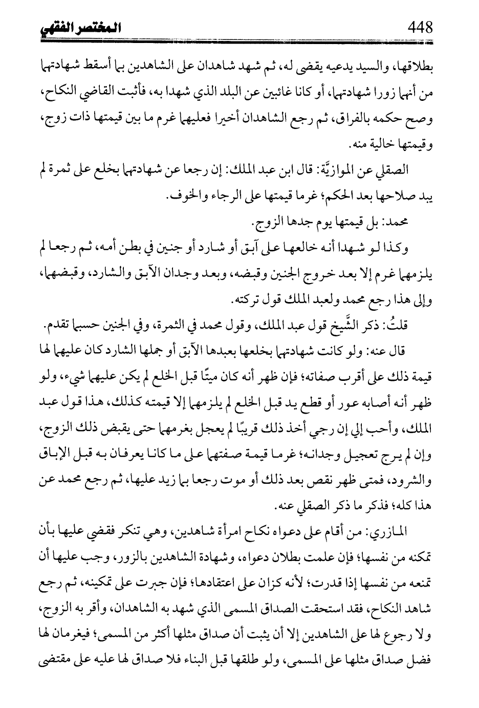المازري: من أقام على دعواه نكاح امرأة شاهدين، وهى تنكر فقضي عليها بأن تمكنه من نفسها؛ فإن عملت بطلان دعواه، وشهادة الشاهدين بالزور، وجب عليها أن تمنعه من نفسها إذا قدرت؛ لأنه كزان على إعتقادها؛ فإن جبرت على تمكينه، ثم رجع شاهد النكاح، فقد استحقت الصداق المسمي الذي شهد به الشاهدان، وأقر به الزوج، ولا رجوع لها على الشاهدين إلا أن يثبت أن صداق مثلها أكثر من المسمى؛ فيغرمان لها فضل صداق مثلها على المسمى، ولو طلقها قبل البناء فلا صداق لها عليه على مقتضى