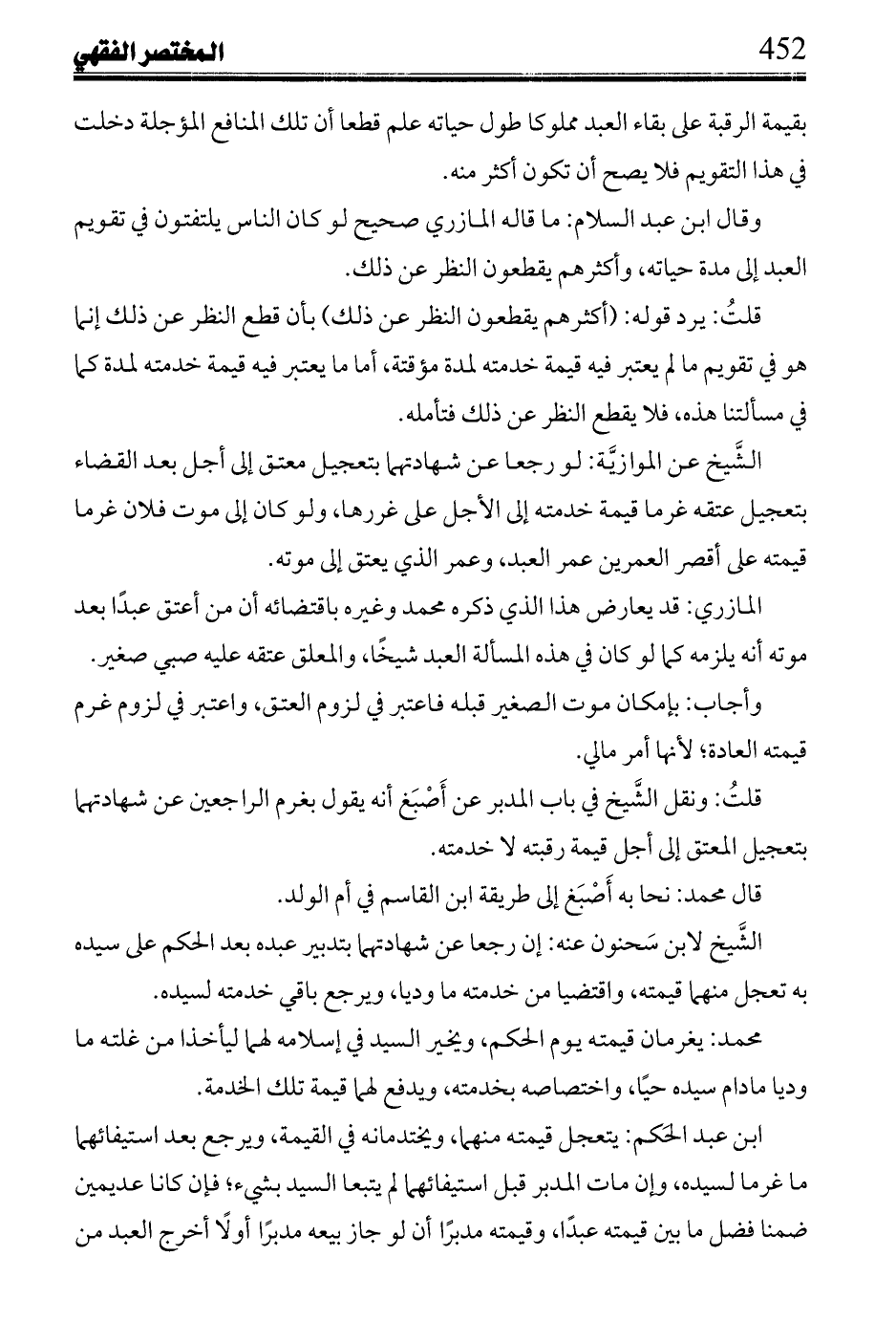 قلت: ونقل الشيخ في باب المدبر عن أصبغ أن يقول بغرم الراجعين عن شهادتهما بتعجيل المعتق إلى أجل قيمة رقبته لا خدمته.