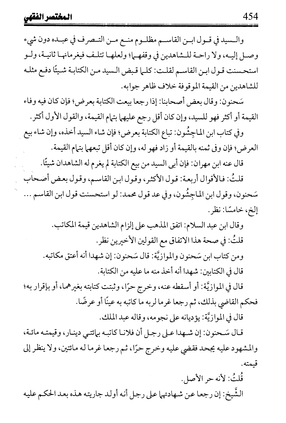 والسيد في قول ابن القاسم مظلوم منع من التصرف في عبده دون شئ وصل إليه، ولا راحة للشاهدين في وقفهما؛ ولعلها تتلف فيغركتمخت ثانية، ولو استحسنت قول ابن القاسم لقلت: كلما قبض السيد من الكتابة شيئاً دفع مثله للشاهدين من القيمةم الموقوفة خلاف ظاهر جوابه.