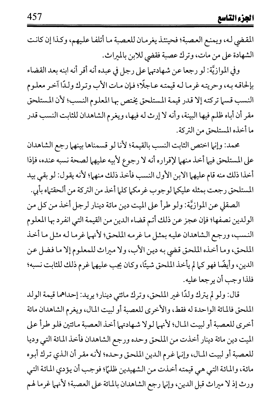 قال: ولم لم يترك ولداً غير الملحق، وترك مائتي دينار؛ يريد: إحداهما قيمة الولد الملحق فالمائة الواحده له فقط، والأخرى للعصبة أو لبيت المال، ويغرم الشاهدان مائة أخرى للعصبه أو لبيت المال؛ لأنهما لولا شهادتهما أخذ العصبة مائتين فلو طرأ على الميت دين مائة دينا أخذت من الملحق وحده ورجع الشاهدان فأخذ المائة التي وديا للعصبة أو لبيت المال، وإنما غرم الدين الملحق وحده؛ لأنه مقر أن الذي ترك أبوه مائة، والمائة التى هى قيمته أخذت من الشهيدين ظلماً؛ فوجب أن يؤدي المائة التي ورث إذ لا ميراث قبل الدين، وإنما رجع الشاهدان بالمائة على العصبة؛ لأنهما غرما لهم