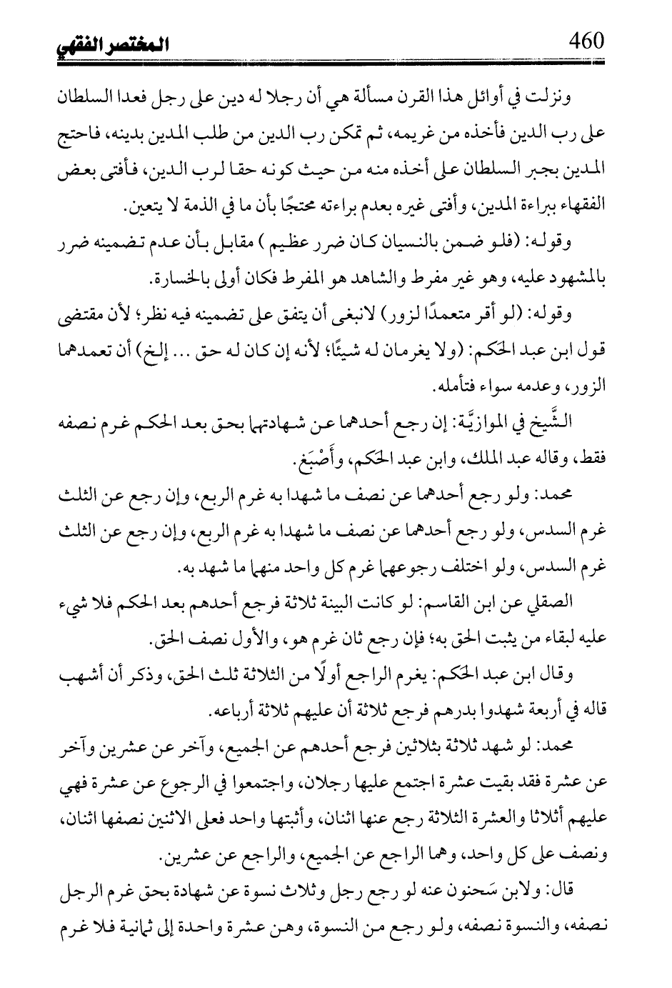 الشيخ فى الموازيه: إن رجع أحدهما عن شهادتهما بحق بعد الحكم غرم نصفه فقط، وقاله عبد الملك، وابن عبد الحكم، وأصبغ.