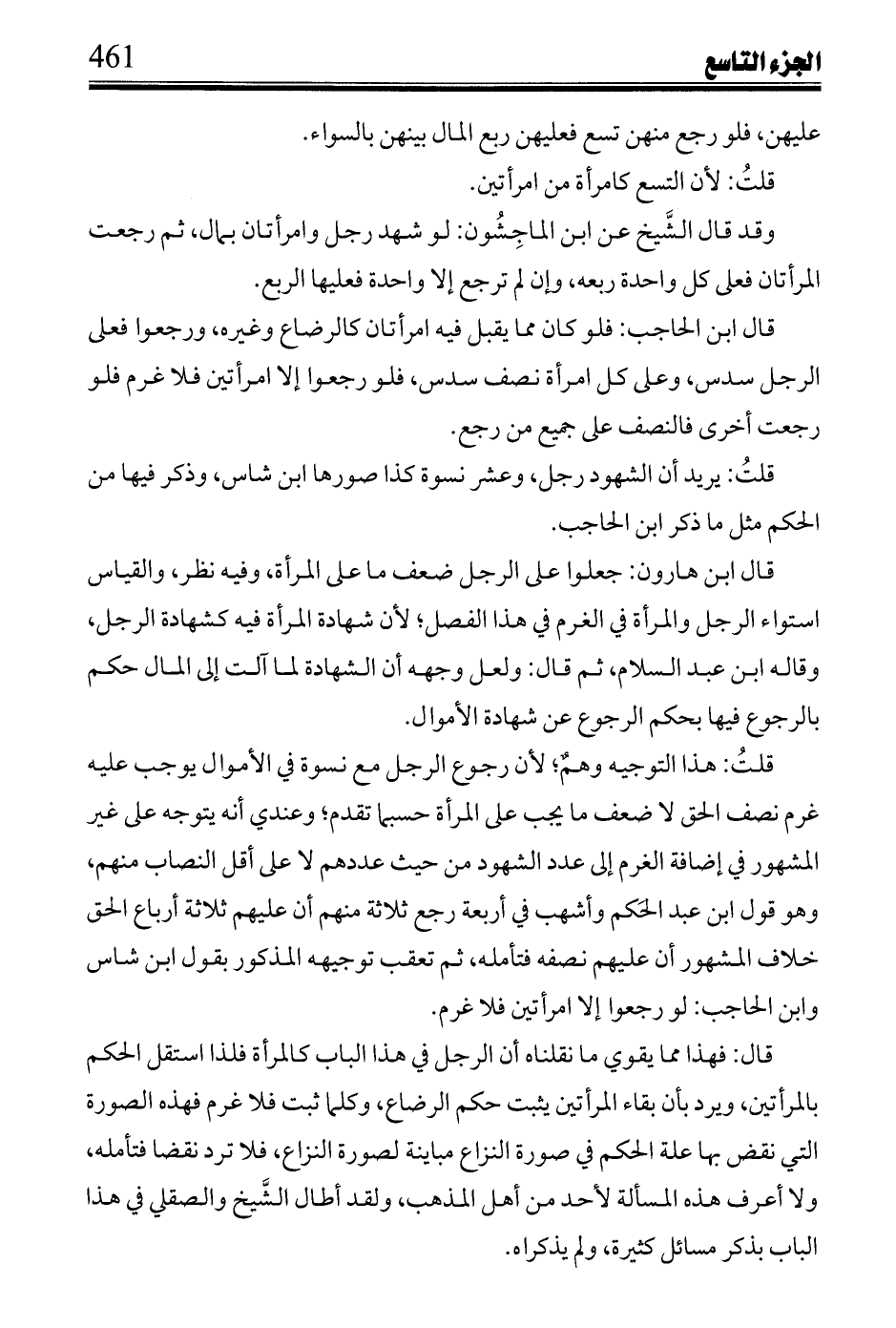 قلت: هذا التوجيه وهمٌ؛ لأن رجوع الرجل مع نسوة في الأموال يوجب عليه غرم نصف الحق لا ضعف ما يجب على المرأى حسبما تقدم؛ وعندي أنه يتوجه على غير المشهور في إضافة الغرم إلى عدد الشهود من حيث عددهم لا على أقل النصاب منهم، وهو قول ابن عبد الحكم وأشهب في أربعة رجع ثلاثة منهم أن عليهم ثلاثة أرباع الحق خلاف المشهور أن عليهم نصفه فتأمله، ثم تعقب توجيهه المذكور بقول ابن شاس وابن الحاجب: لو رجعوا إلا إمرأتين فلا غرم.