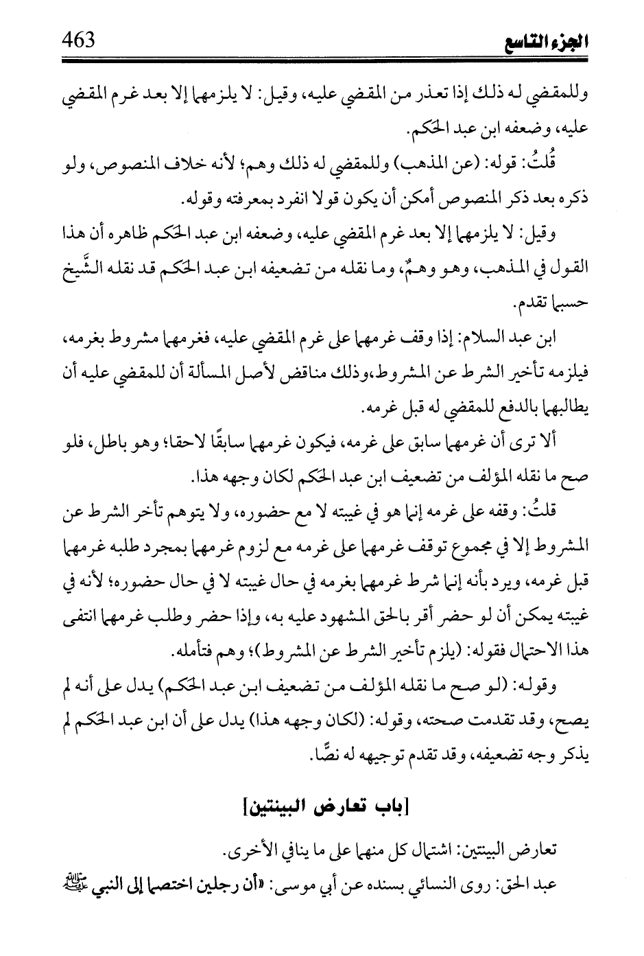 ابن عبد السلام: إذا وقف غرمهما على غرم المقضي عليه، فغرمهما مشروط بغرمه، فيلزمه تأخير الشرط عن المشروط، وذلك مناقض لأصل المسألة أن للمقضي عليه أن يطالبهما بالدفع للمقضي له قبل غرمه.