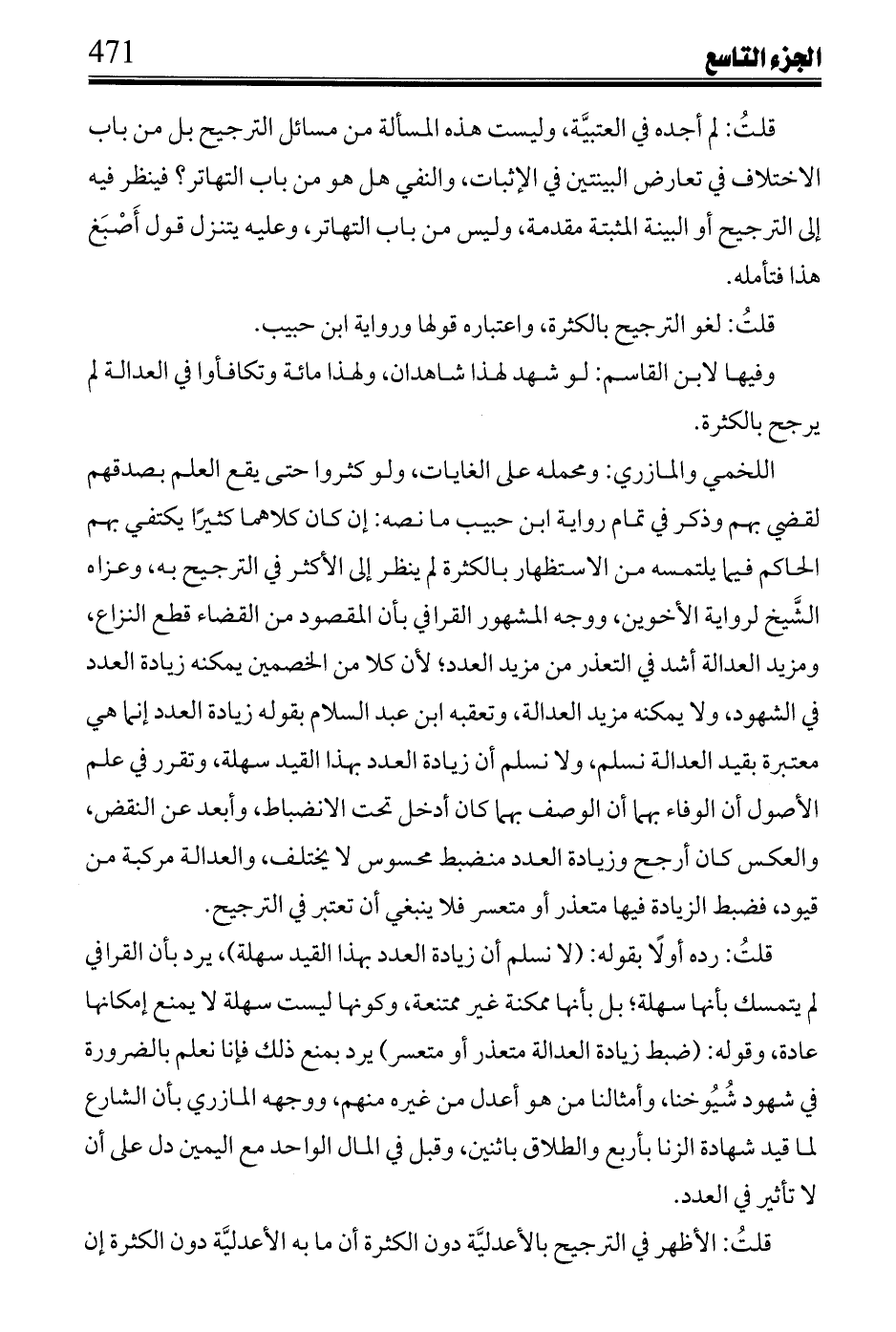 قلت: رده أولاً بقوله: (لا نسلم أن زيادة العدد بهذا القيد سهلة)، يرد بأن القرافي لم يتمسك بأنها سهلة؛ بل بأنها ممكنة غير ممتنعة، وكونها ليست سهلة لا يمنع إمكانها عادة، وقوله: (ضبط زيادة العدالة متعذر أو متعسر) يرد بمنع ذلك فإنا نعلم بالضرورة في شهود شيوخنا، وأمثالنا من هو أعدل من غيره منهم، ووجهه المازري بأن الشارع لما قيد شهادة الزنا بأربع والطلاق باثنين، وقبل في المال الواحد مع اليمين دل على أن لا تأثير في العدد.