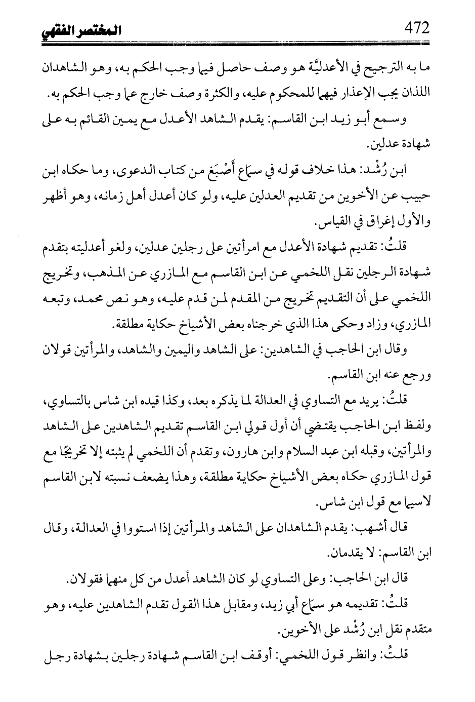 قلت: تقديم شهادة الأعدل مع امرأتين على رجلين عدلين، ولغو أعدليته بتقدم شهادة الرجلين نقل اللخمي عن ابن القاسم مع المازري عن المذهب، وتخريج اللخمي على أن التقديم تخريج من المقدم لمن قدم عليه، وهو نص محمد، وتبعه المازري، وزاد وحكى هذا الذي خرجناه بعض الأشياخ حكاية مطلقة.