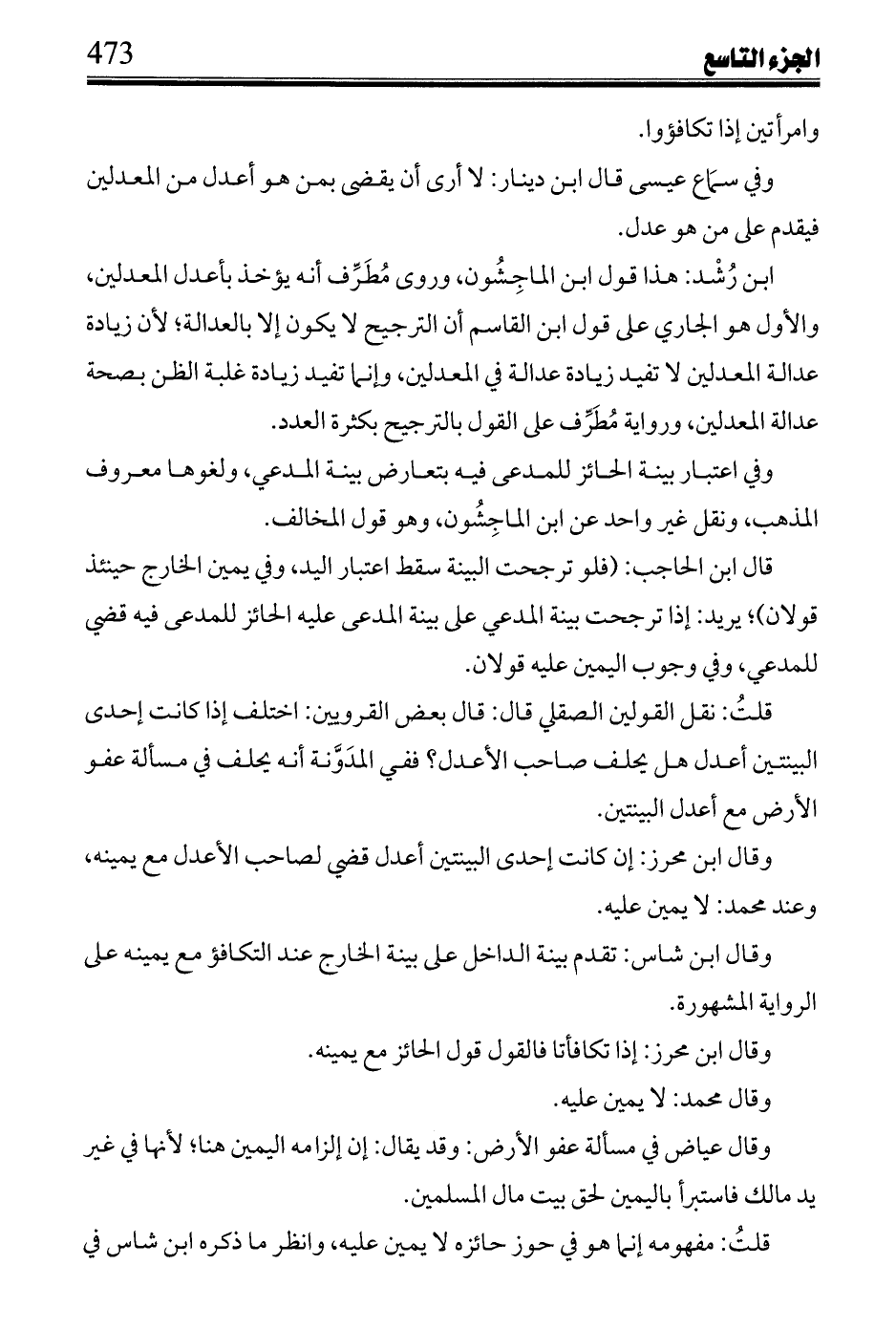 قلتُ: نقل القولين الصقلي قال: قال بعض القرويين: اختلف إذا كانت إحدى البينتين أعدل هل يحلف صاحب الأعدل؟ ففي المدونة أنه يحلف في مسألة عفو الأرض مع أعدل البينتين.
