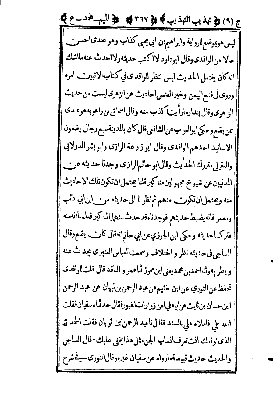 ليس هو بموضع للرواية وإبراهيم بن أبي يحيى كذاب وهو عندي أحسن حالا من الواقدي وقال أبو داود لا أكتب حديثه ولا أحدث عنه ما أشك أنه كان يفتعل الحديث ليس ننظر للواقدي في كتاب الا تبين أمره وروى في فتح اليمن وخبر العنسي أحاديث عن الزهري ليست من حديث الزهري وقال بندار ما رأيت أكذب منه وقال إسحاق بن راهويه هو عندي ممن يضع وحكى أبو العرب عن الشافعي قال كان بالمدينة سبع رجال يضعون الأسانيد أحدهم الواقدي وقال أبو زرعة الرازي وأبو بشر الدولابي والعقيلي متروك الحديث وقال أبو حاتم الرازي وجدنا حديثه عن المدنيين عن شيوخ مجهولين مناكير قلنا يحتمل أن تكون تلك الأحاديث منه ويحتمل أن تكون منهم ثم نظرنا إلى حديثه من بن أبي ذئب ومعمر فإنه يضبط حديثهم فوجدناه قد حدث عنهما بالمناكير فعلمنا أنه منه فتركنا حديثه وحكى بن الجوزي عن أبي حاتم أنه قال كان يضع وقال الساجي في حديثه نظر واختلاف وسمعت العباس العنبري يحدث عنه ويطريه وثنا أحمد بن محمد يعني بن محرز ثنا عمرو الناقد قال قلت للواقدي تحفظ عن الثوري عن بن خثيم عن عبد الرحمن بن نبهان عن عبد الرحمن بن حسان بن ثابت عن أبيه في لعن زوارات القبور فقال حدثنا سفيان فقلت لعله علي فأملاه علي بالسند فقال أبا انا عبد الرحمن بن ثوبان فقلت الحمد لله الذي أوقعك أنت تعرف أنساب الجن مثل هذا يخفى عليك قال الساجي والحديث حديث قبيصة ما رواه عن سفيان غيره وقال النووي في شرح