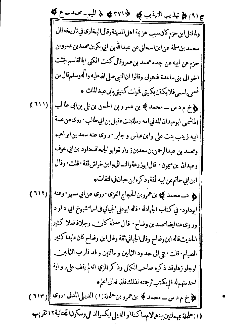 613 – "خ م د س – محمد" بن عمرو بن الحسن بن علي بن أبي طالب الهاشمي أبو عبد الله المدني أمه رملة بنت عقيل بن أبي طالب روى عن عمة أبيه زينب بنت علي وابن عباس وجابر روى عنه سعد بن إبراهيم ومحمد بن عبد الرحمن بن سعد بن زرارة وأبو الجحاف داود بن أبي عوف عبد الله بن ميمون قال أبو زرعة والنسائي وابن خراش ثقة قلت وقال بن أبي حاتم عن أبيه ثقة وذكره بن حبان في الثقات