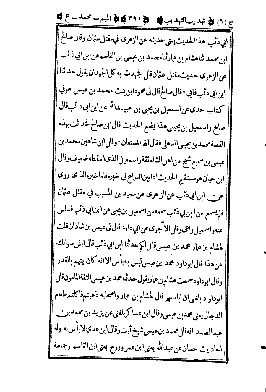 أبي ذئب هذا الحديث يعني حديثه عن الزهري في مقتل عثمان وقال صالح بن محمد ثنا هشام بن عمار ثنا محمد بن عيسى بن القاسم عن بن أبي ذئب عن الزهري حديث مقتل عثمان قال فجهدت به كل الجهد أن يقول حدثنا بن أبي ذئب فأبى قال صالح قال لي محمود بن بنت محمد بن عيسى هو في كتاب جدي عن إسماعيل بن يحيى بن عبيد الله عن بن أبي ذئب قال صالح وإسماعيل بن يحيى هذا يضع الحديث قال بن صالح فحدثت بهذه القصة محمد بن يحيى الذهلي فقال الله المستعان وقال بن شاهين محمد بن عيسى بن سميع شيخ من أهل الشام ثقة وإسماعيل الذي أسقطه ضعيف وقال بن حبان هو مستقيم الحديث إذا بين السماع في خبره فأما خبره الذي روى عن بن أبي ذئب عن الزهري عن سعيد بن المسيب في مقتل عثمان فلم يسمع من بن أبي ذئب سمعه من إسماعيل بن يحيى عن بن أبي ذئب فدلس عنه وإسماعيل واهي وقال الآجري عن أبي داود قال لي عيسى بن شاذان قلت لهشام بن عمار محمد بن عيسى قال لكم حدثنا بن أبي ذئب قال إيش سؤالك عن هذا قال أبو داود محمد بن عيسى ليس به بأس إلا أنه كان يتهم بالقدر وقال أبو داود سمعت هشام بن عمار يقول حدثنا محمد بن عيسى الثقة المأمون قال أبو داود بلغني أن أبا مسهر قال لهشام بن عمار وأصحابه ذهبتم فأكلتم طعام الدجال يعني محمد بن عيسى وقال بن عساكر بلغني عن يزيد بن محمد بن عبد الصمد أنه قال محمد بن عيسى شيخ ثبت وقال بن عدي لا بأس به وله أحاديث حسان عن عبد الله يعني بن عمر وروح يعني بن القاسم وجماعة