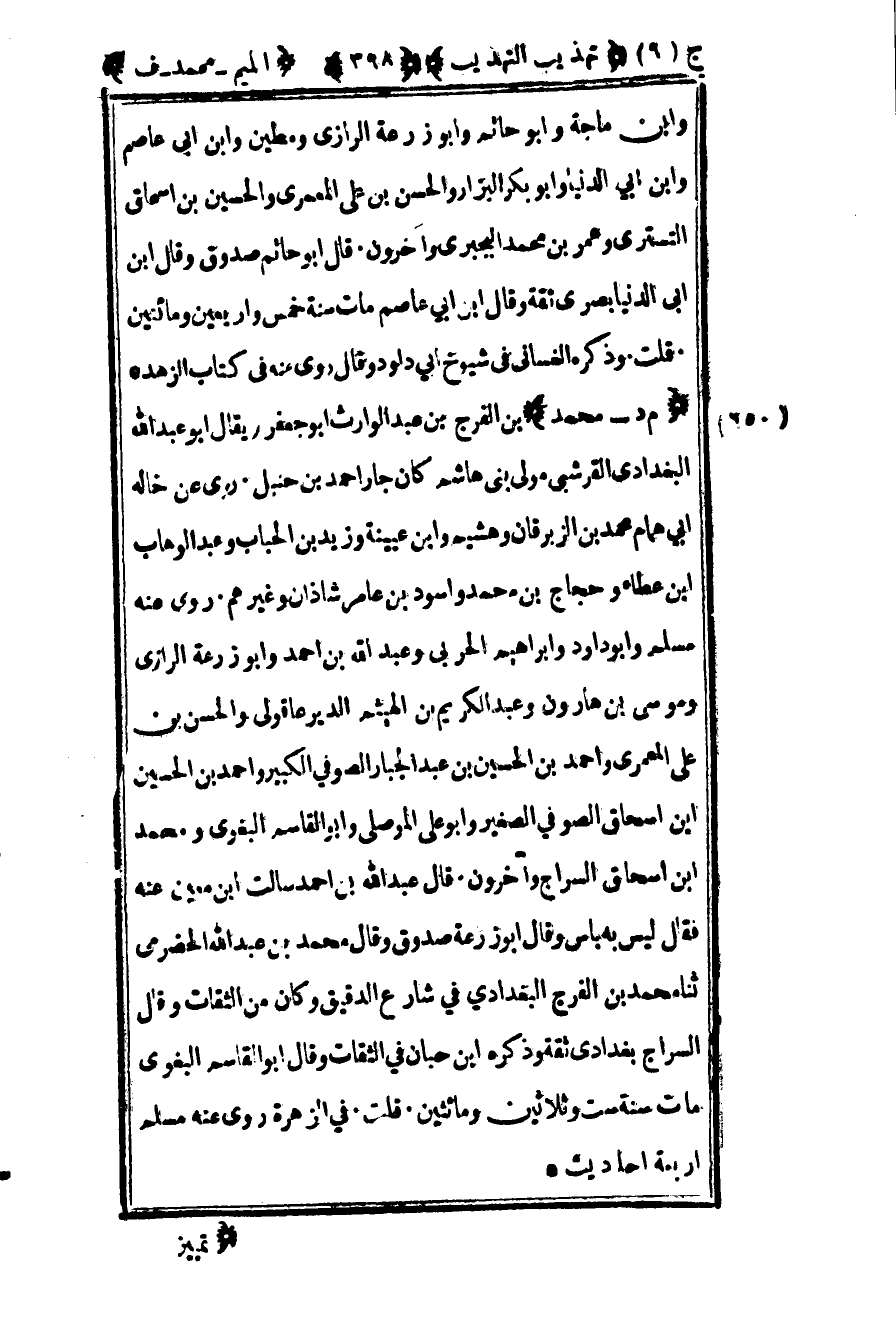 652- "م د – محمد" بن الفرج بن عبد الوارث أبو جعفر ويقال أبو عبد الله البغدادي القرشي مولى بني هاشم كان جار أحمد بن حنبل روى عن خاله أبي همام محمد بن الزبرقان وهشيم وابن عيينة وزيد بن الحباب وعبد الوهاب بن عطاء وحجاج بن محمد وأسود بن عامر شاذان وغيرهم روى عنه مسلم وأبو داود وإبراهيم الحربي وعبد الله بن أحمد وأبو زرعة الرازي وموسى بن هارون وعبد الكريم بن الهيثم الدير عاقولي والحسن بن علي المعمري وأحمد بن الحسن بن عبد الجبار الصوفي الكبير وأحمد بن الحسين بن إسحاق الصوفي الصغير وأبو علي الموصلي وأبو القاسم البغوي ومحمد بن إسحاق السراج وآخرون قال عبد الله بن أحمد سألت بن معين عنه فقال ليس به بأس وقال أبو زرعة صدوق وقال محمد بن عبد الله الحضرمي ثنا محمد بن الفرج البغدادي في شارع الدقيق وكان من الثقات وقال السراج بغدادي ثقة وذكره بن حبان في الثقات وقال أبو القاسم البغوي مات سنة ست وثلاثين ومائتين قلت في الزهرة روى عنه مسلم وأربعة أحاديث
