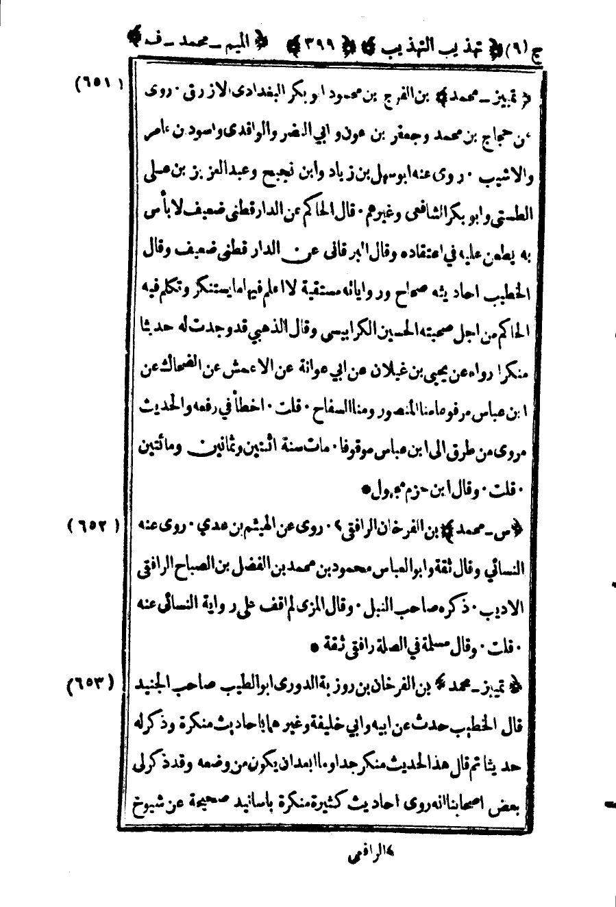 654 – "س – محمد" بن الفرخان الرافقي1 روى عن الهيثم بن عدي روى عنه النسائي وقال ثقة وأبو العباس محمود بن محمد بن الفضل بن الصباح الرافقي الأديب ذكره صاحب النبل وقال المزي لم أقف على رواية النسائي عنه قلت وقال مسلمة في الصلة رافقي ثقة
