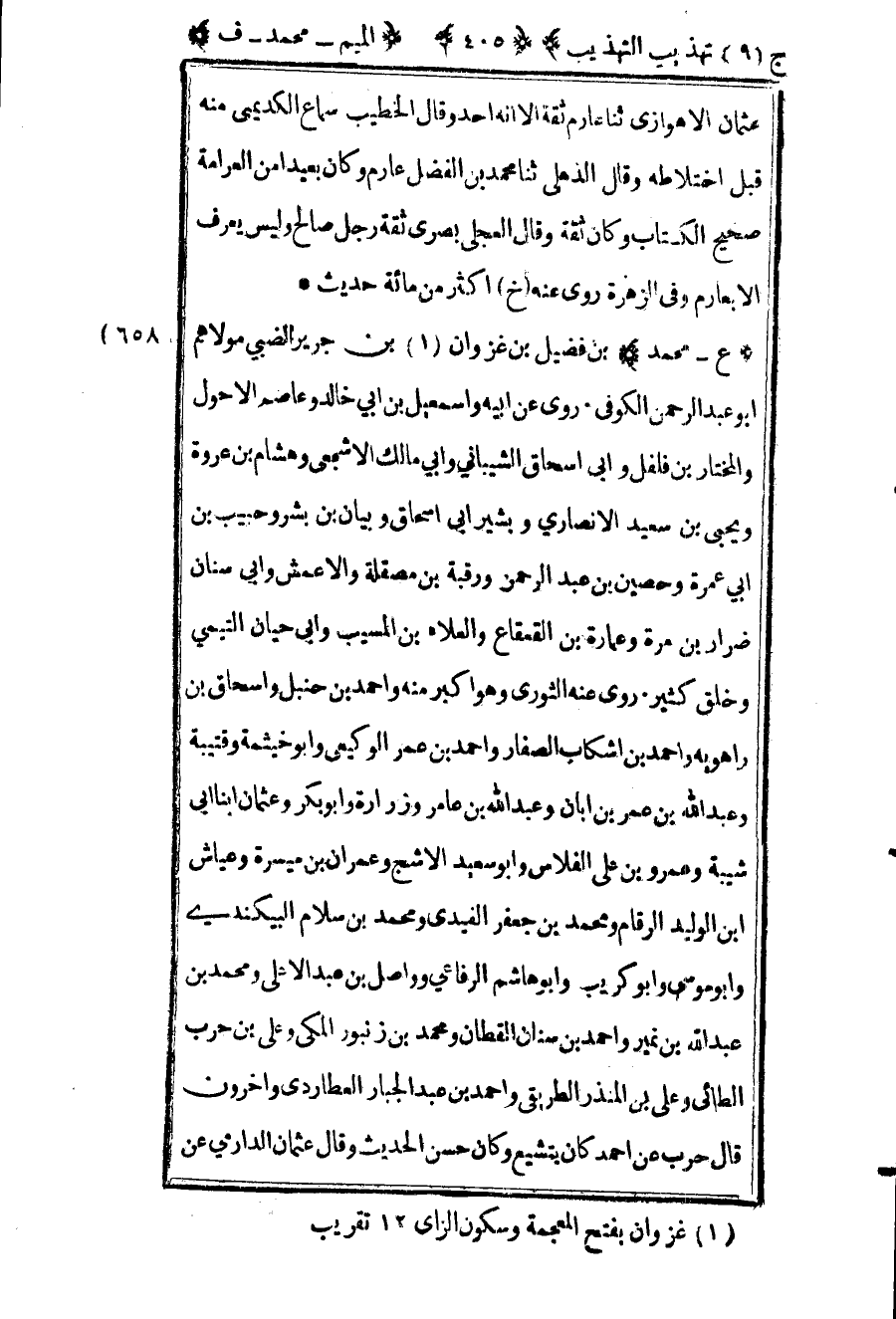 660 – "ع – محمد" بن فضيل بن غزوان1 بن جرير الضبي مولاهم أبو عبد الرحمن الكوفي روى عن أبيه وإسماعيل بن أبي خالد وعاصم الأحول والمختار بن فلفل وأبي إسحاق الشيباني وأبي مالك الأشجعي وهشام بن عروة ويحيى بن سعيد الأنصاري وبشير أبي إسحاق وبيان بن بشر وحبيب بن أبي عمرة وحصين بن عبد الرحمن ورقبة بن مصقلة والأعمش وأبي سنان ضرار بن مرة وعمارة بن القعقاع والعلاء بن المسيب وأبي حيان التميمي وخلق كثير روى عنه الثوري وهو أكبر منه وأحمد بن حنبل وإسحاق بن راهويه وأحمد بن أشكاب الصفار وأحمد بن عمر الوكيعي وأبو خيثمة وقتيبة وعبد الله بن عمر بن أبان وعبد الله بن عامر وزرارة وأبو بكر وعثمان ابنا أبي شيبة وعمرو بن علي الفلاس وأبو سعيد الأشج وعمران بن ميسرة وعياش بن الوليد الرقام ومحمد بن جعفر الفيدي ومحمد بن سلام البيكندي وأبو موسى وأبو كريب وأبو هاشم الرفاعي وواصل بن عبد الأعلى ومحمد بن عبد الله بن نمير وأحمد بن سنان القطان ومحمد بن زنبور المكي وعلي بن حرب الطائي وعلي بن المنذر الطريقي وأحمد بن عبد الجبار العطاردي وآخرون قال حرب عن أحمد كان يتشيع وكان حسن الحديث وقال عثمان الدارمي عن