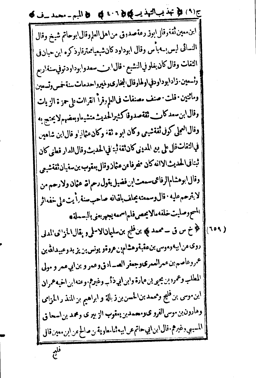 661 – "خ س ق – محمد" بن فليح بن سليمان الأسلمي ويقال الخزاعي المدني روى عن أبيه وموسى بن عقبة وهشام بن عروة ويونس بن يزيد وعبيد الله بن عمر وعاصم بن عمر العمري وجعفر الصادق وعمرو بن أبي عمرو مولى المطلب وعمرو بن يحيى بن عمارة وابن أبي ذئب وغيرهم وعنه بن أخيه عمران بن موسى بن فليح ومحمد بن الحسن بن زبالة وإبراهيم بن المنذر الحزامي وهارون بن موسى الفروي ومحمد بن يعقوب الزبيري ومحمد بن إسحاق المسيبي وغيرهم قال بن أبي حاتم عن أبيه ثنا معاوية بن صالح عن بن معين قال