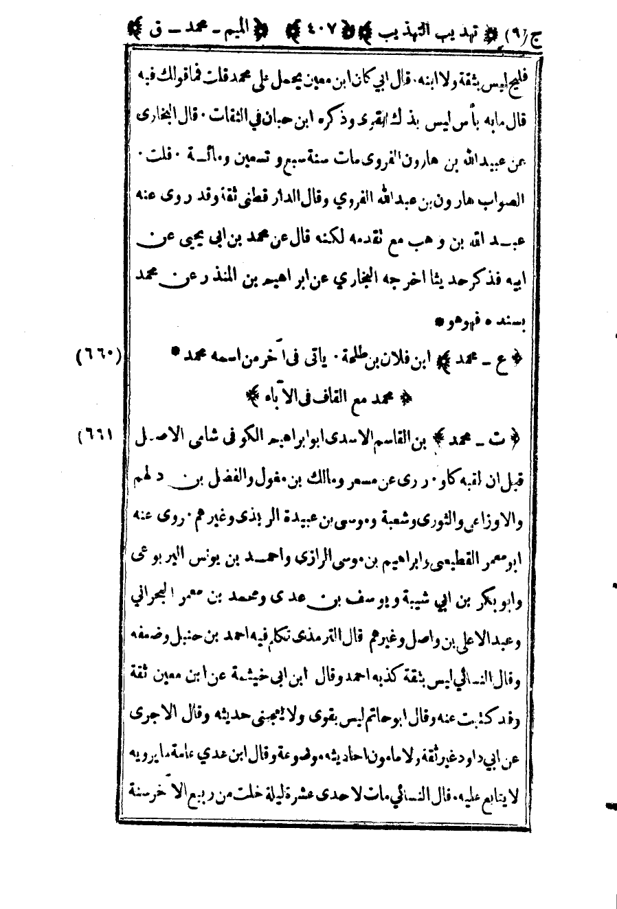 663 – "ت – محمد" بن القاسم الأسدي أبو إبراهيم الكوفي شامي الأصل قيل أن لقبه كاو روى عن مسعود ومالك بن مغول والفضل بن دلهم والأوزاعي والثوري وشعبة وموسى بن عبيدة الربذي وغيرهم روى عنه أبو معمر القطيعي وإبراهيم بن موسى الرازي وأحمد بن يونس اليربوعي وأبو بكر بن أبي شيبة ويوسف بن عدي ومحمد بن معمر البحراني وعبد الأعلى بن واصل وغيرهم قال الترمذي تكلم فيه أحمد بن حنبل وضعفه وقال النسائي ليس بثقة كذبة أحمد وقال بن أبي خيثمة عن بن معين ثقة وقد كتبت عنه وقال أبو حاتم ليس بقوي ولا يعجبني حديثه وقال الآجري عن أبي داود غير ثقة ولا مأمون أحاديثه موضوعة وقال بن عدي عامة ما يرويه لا يتابع عليه قال النسائي مات لإحدى عشرة ليلة خلت من ربيع الآخر سنة