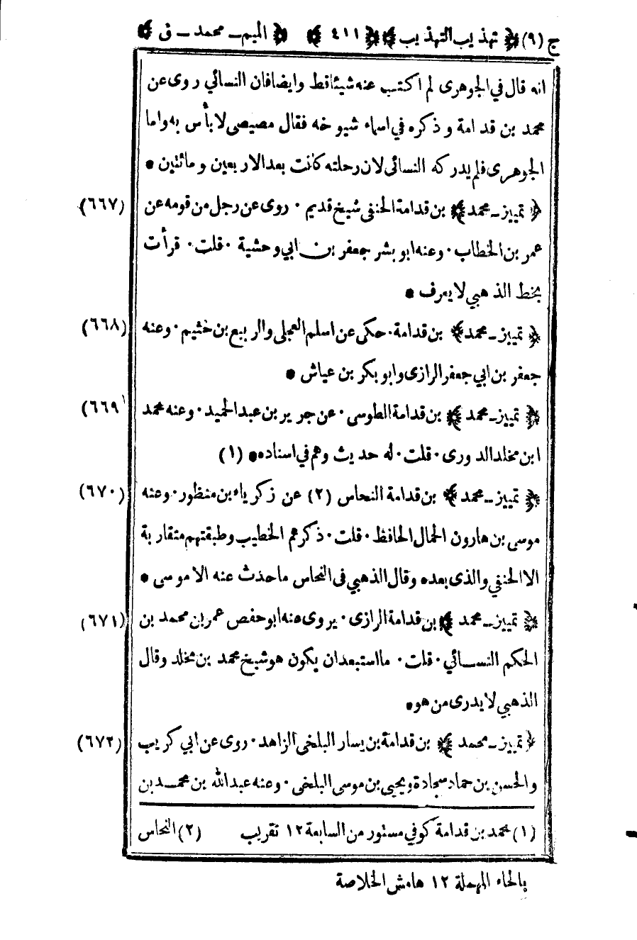 672 – "تمييز – محمد" بن قدامة النحاس2 عن زكريا بن منظور وعنه موسى بن هارون الحمال الحافظ قلت ذكرهم الخطيب وطبقتهم متقاربة إلا الحنفي والذي بعده وقال الذهبي في النحاس ما حدث عنه إلا موسى