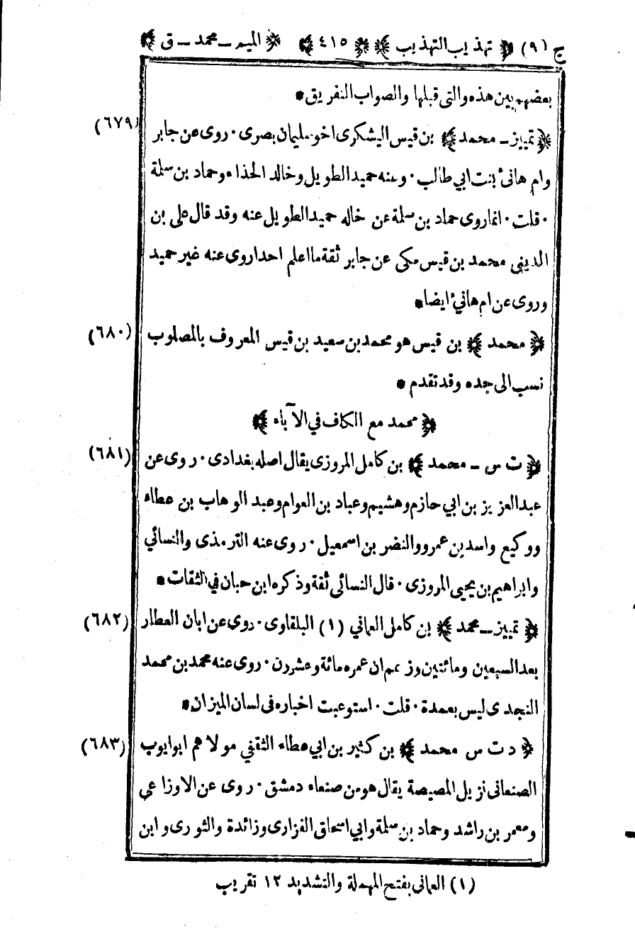 684 – "تمييز – محمد" بن كامل العماني1 البلقاوي روى عن أبان العطار بعد السبعين ومائتين وزعم أن عمره مائة وعشرون روى عنه محمد بن محمد النجدي ليس بعمدة قلت استوعبت أخباره في لسان الميزان