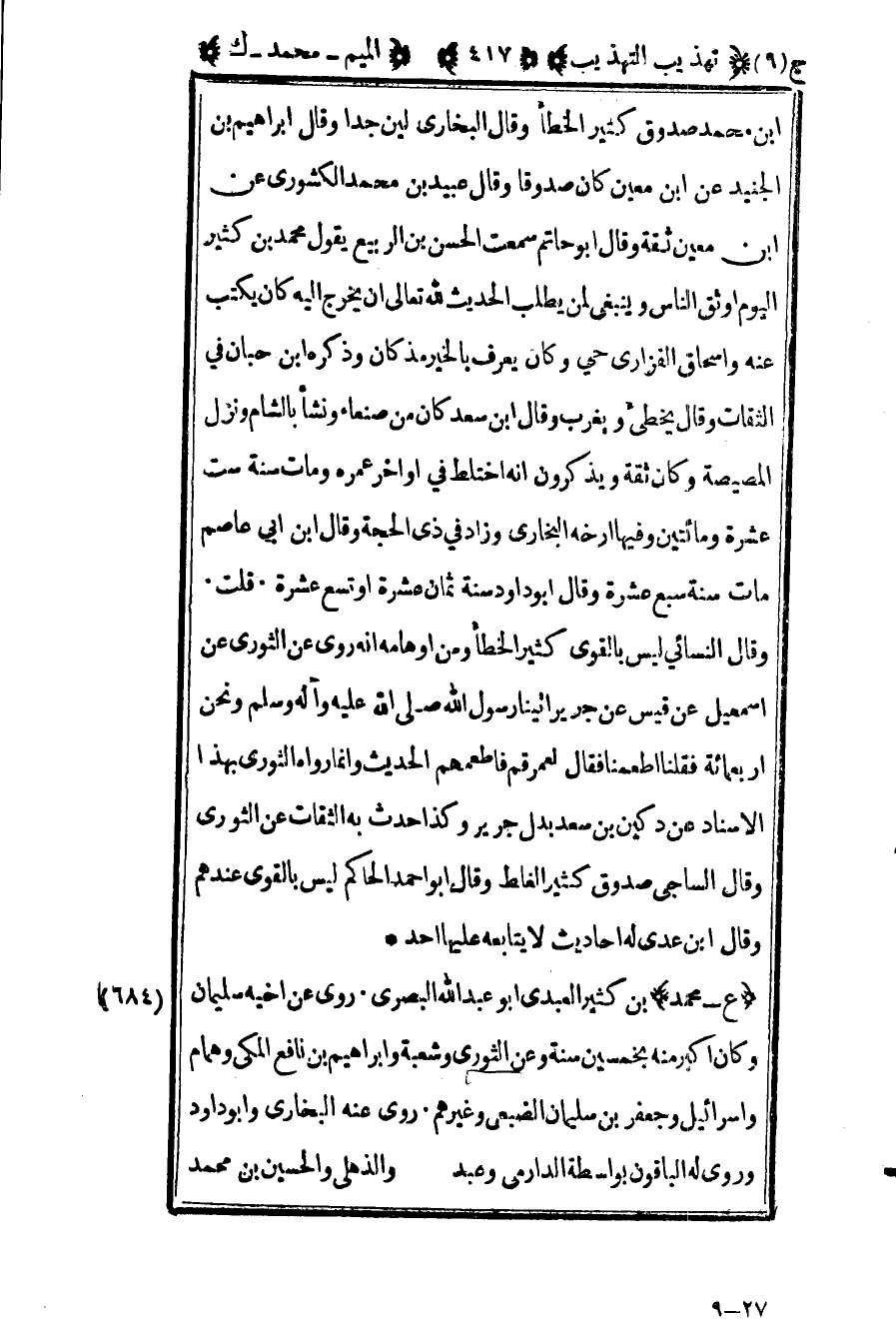 686 – "ع – محمد" بن كثير العبدي أبو عبد الله البصري روى عن أخيه سليمان وكان أكبر منه بخمسين سنة وعن الثوري وشعبة وإبراهيم بن نافع المكي وهمام وإسرائيل وجعفر بن سليمان الضبعي وغيرهم روى عنه البخاري وأبو داود وروى له الباقون بواسطة الدارمي وعبد والذهلي والحسين بن محمد