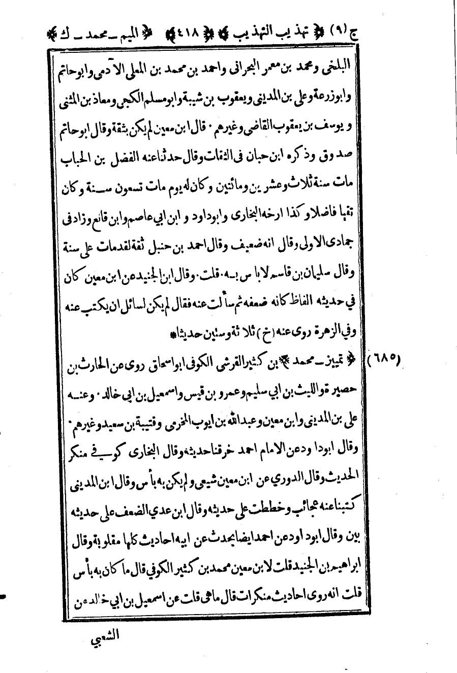 687 – "تمييز – محمد" بن كثير القرشي الكوفي أبو إسحاق روى عن الحارث بن حصيرة والليث بن أبي سليم وعمرو بن قيس وإسماعيل بن أبي خالد وعنه علي بن المديني وابن معين وعبد الله بن أيوب المخرمي وقتيبة بن سعيد وغيرهم وقال أبو داود عن الإمام أحمد خرقنا حديثه وقال البخاري كوفي منكر الحديث وقال الدوري عن بن معين شيعي ولم يكن به بأس وقال بن المديني كتبنا عنه عجائب وخططت على حديثه وقال بن عدي الضعف على حديثه بين وقال أبو داود عن أحمد أيضا يحدث عن أبيه أحاديث كلها مقلوبة وقال إبراهيم بن الجنيد قلت لابن معين محمد بن كثير الكوفي قال ما كان به بأس قلت إنه روى أحاديث منكرات قال ما هي قلت عن إسماعيل بن أبي خالد عن