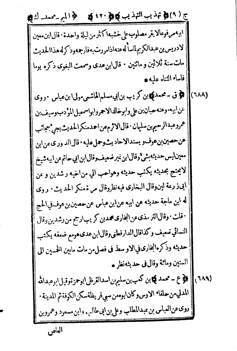690 – "ق – محمد" بن كريب بن أبي مسلم الهاشمي مولى بن عباس روى عن أبيه وعنه حبان بن علي وأبو خالد الأحمر وأبو إسماعيل المؤدب وسيف بن عمر وعبد الرحيم بن سليمان قال الأثرم عن أحمد منكر الحديث يجيء بعجائب عن حصين بن عوف ويسند الأحاديث وحمل عليه قال الدوري عن بن معين ليس حديث بشيء وقال بن نمير ضعيف وقال بن أبي حاتم عن أبيه شيخ لا يحتج بحديثه يكتب حديثه وهو أحب إلي من أخيه رشدين وعن أبي زرعة لين وقال البخاري فيه نظر وقال مرة منكر الحديث روى له بن ماجة حديثه عن أبيه عن بن عباس عن حصين بن عوف في الحج قلت وقال الترمذي عن البخاري محمد بن كريب أرجح من رشدين وقال النسائي ضعيف وكذا قال الدارقطني وقال بن عدي هو مع ضعفه يكتب حديثه وذكره البخاري في الأوسط في فصل من مات ما بين الخمسين إلى الستين ومائة وقال في حديثه نظر