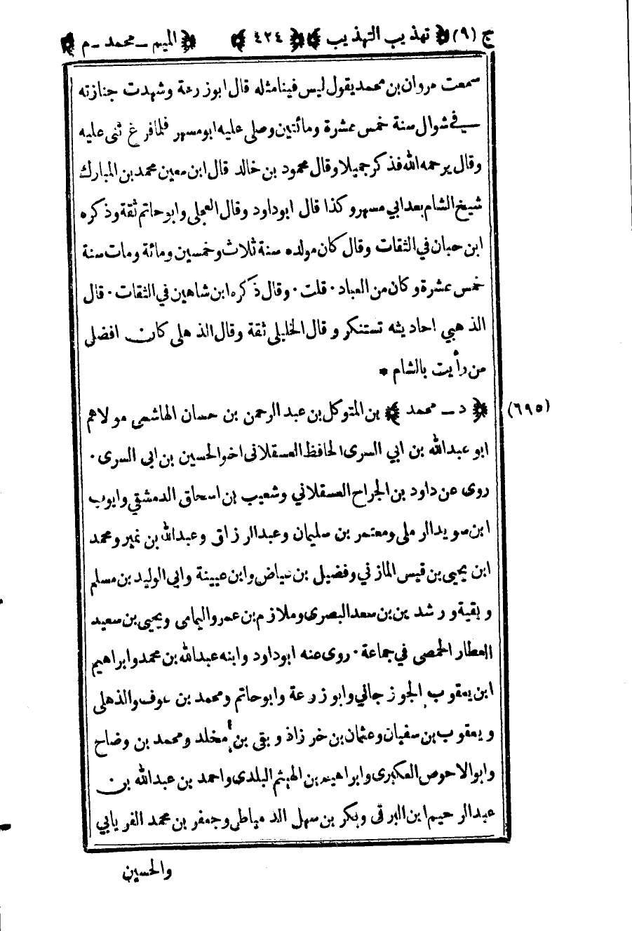 697 – "د – محمد" بن المتوكل بن عبد الرحمن بن حسان الهاشمي مولاهم أبو عبد الله بن أبي السري الحافظ السعقلاني أخو الحسن بن أبي السري روى عن داود بن الجراح العسقلاني وشعيب بن إسحاق الدمشقي وأيوب بن سويد الرملي ومعتمر بن سليمان وعبد الرزاق وعبد الله بن نمير ومحمد بن يحيى بن قيس المازني وفضيل بن عياض وابن عيينة وأبي الوليد بن مسلم وبقية ورشدين بن سعد البصري وملازم بن عمرو اليمامي ويحيى بن سعيد العطار الحمصي في جماعة روى عنه أبو داود وابنه عبد الله بن محمد وإبراهيم بن يعقوب الجوزجاني وأبو زرعة وأبو حاتم ومحمد بن عوف والذهلي ويعقوب بن سفيان وعثمان بن خرزاذ وبقي بن مخلد ومحمد بن وضاح وأبو الأحوص العكبري وإبراهيم بن الهيثم البلدي وأحمد بن عبد الله بن عبد الرحيم بن البرقي وبكر بن سهل الدمياطي وجعفر بن محمد الفريابي
