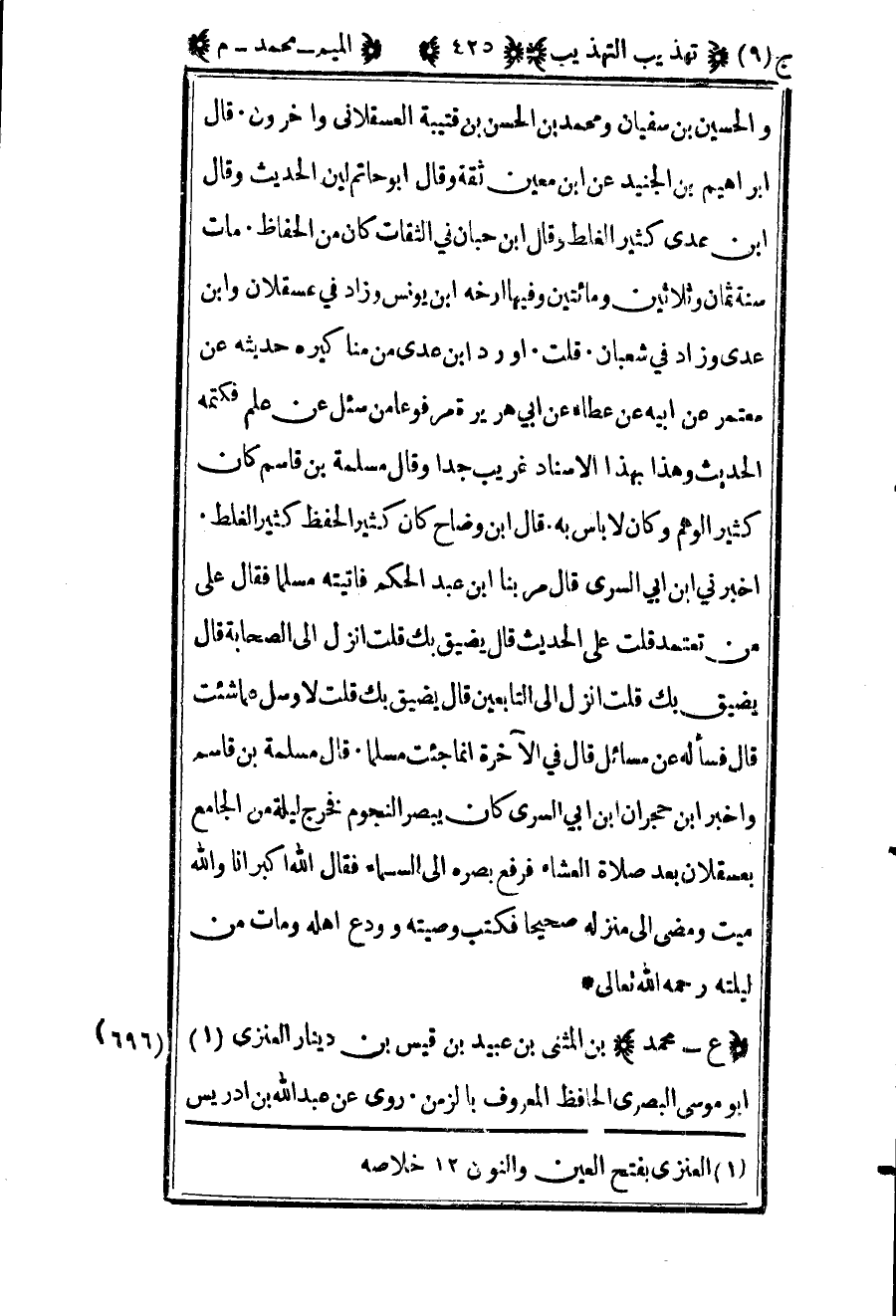698 – "ع – محمد" بن المثنى بن عبيد بن قيس بن دينار العنزي1 أبو موسى البصري الحافظ المعروف بالزمن روى عن عبد الله بن إدريس