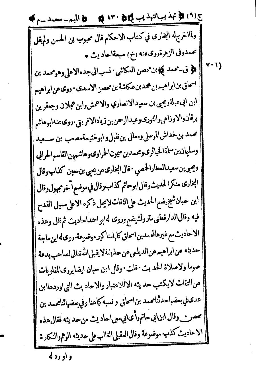 703 - ق محمد بن محصن العكاشي نسب إلى جده الأعلى وهو محمد بن إسحاق بن إبراهيم بن محمد بن عكاشة بن محصن الأسدي روى عن إبراهيم بن أبي عبلة ويحيى بن سعيد الأنصاري والأعمش وابن عجلان وجعفر بن برقان والأوزاعي والثوري وعبد الرحمن بن زياد الإفريقي روى عنه أبو هاشم محمد بن خداش الموصلي ومعلل بن نفيل وأبو خيثمة مصعب بن سعيد وسليمان بن سلمة الخبائري ومحمد بن ميمون الحمراوي وهاشم بن القاسم الحراني ويحيى بن سعيد العطار الحمصي قال البخاري عن يحيى بن معين كذاب وقال البخاري منكر الحديث وقال أبو حاتم كذاب وقال في موضع آخر مجهول وقال ابن حبان شيخ يضع الحديث على الثقات لا يحل ذكره إلا على سبيل القدح فيه وقال الدارقطني متروك يضع وروى له أبو أحمد أحاديث ثم قال وهذه الأحاديث مع غيرها لمحمد بن إسحاق كلها مناكير موضوعة روى له ابن ماجة حديثه عن إبراهيم عن الديلمي عن حذيفة لا يقبل الله تعالى لصاحب بدعة صوما ولا صلاة الحديث قلت وقال ابن حبان أيضا يروي المقلوبات عن الثقات لا يكتب حديثه إلا للاعتبار والأحاديث التي أوردها ابن عدي في بعضها حدثنا محمد بن إسحاق ونسبه كما هنا وفي بعضها ثنا محمد بن محصن وقال ابن أبي حاتم رأى أبي معي أحاديث من حديثه فقال هذه الأحاديث كذب موضوعة وقال العقيلي الغالب على حديثه الوهم والنكارة