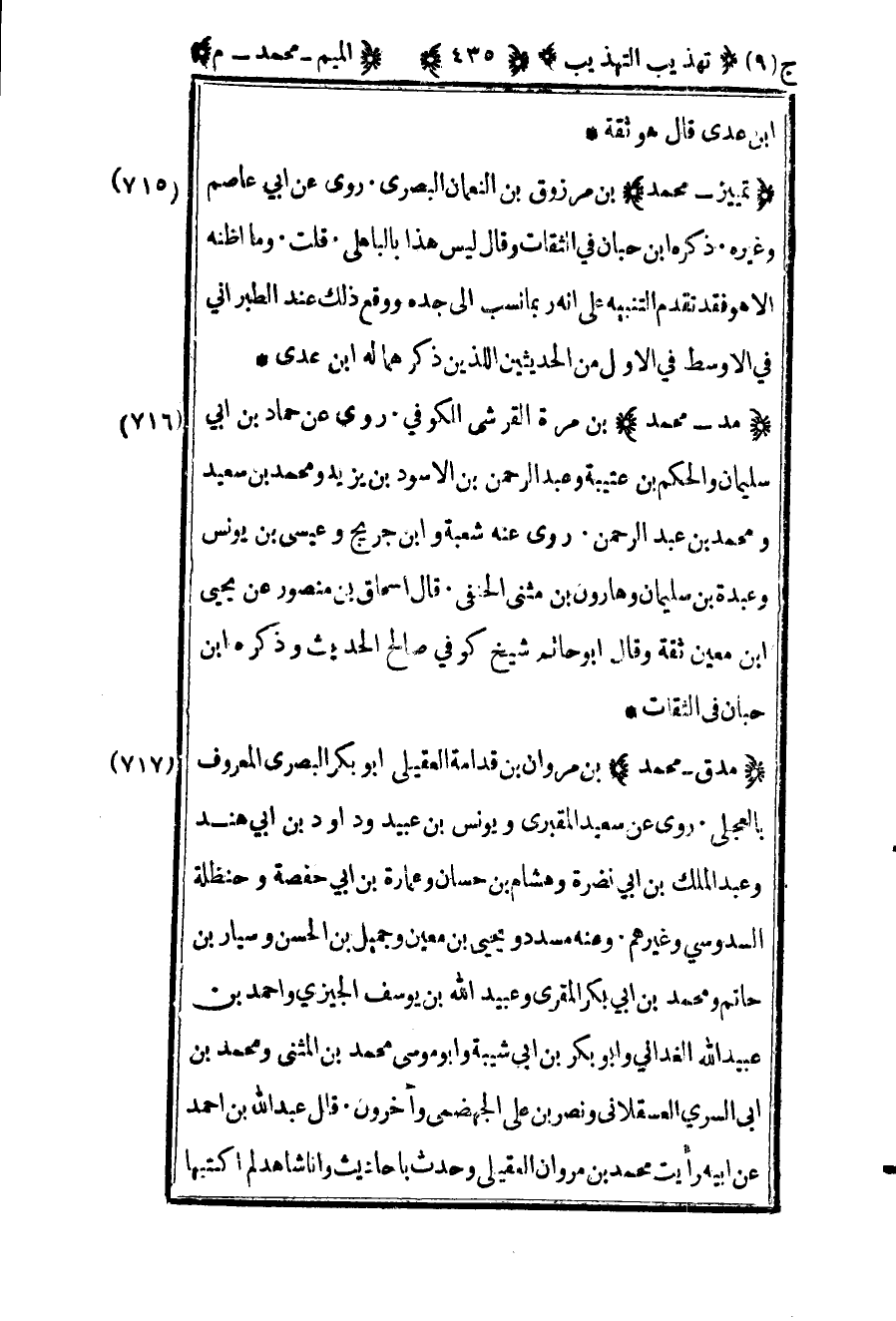 717 – "تمييز – محمد" بن مرزوق بن النعمان البصري روى عن أبي عاصم وغيره ذكره ابن حبان في الثقات وقال ليس هذا بالباهلي قلت وما أظنه إلا هو فقد تقدم التنبيه على أنه ربما نسب إلى جده ووقع ذلك عند الطبراني في الأوسط في الأول من الحديثين الذين ذكرهما له بن عدي