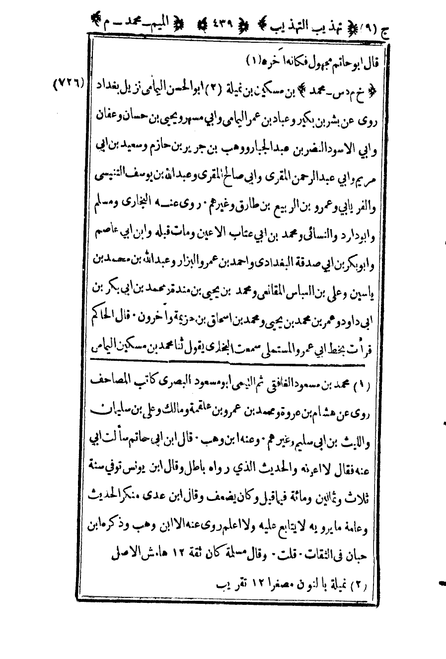728 – "خ م د س – محمد" بن مسكين بن نميلة2 أبو الحسن اليمامي نزيل بغداد روى عن بشر بن بكير وعباد بن عمر اليمامي وأبي مسهر ويحيى بن حسان وعفان وأبي الأسود النضر بن عبد الجبار ووهب بن جرير بن حازم وسعيد بن أبي مريم وأبي عبد الرحمن المقري وأبي صالح المقري وعبد الله بن يوسف التنيسي والفريابي وعمرو بن الربيع بن طارق وغيرهم روى عنه البخاري ومسلم وأبو داود والنسائي ومحمد بن أبي عتاب الأعين ومات قبله وابن أبي عاصم وأبو بكر بن أبي صدقة البغدادي وأحمد بن عمر البزار وعبد الله بن محمد بن ياسين وعلي بن العباس المقانعي ومحمد بن يحيى بن مندة ومحمد بن أبي بكر بن أبي داود وعمر بن محمد بن يحيى ومحمد بن إسحاق بن خزيمة وآخرون قال الحاكم قرأت بخط أبي عمرو المستملى سمعت البخاري يقول ثنا محمد بن مسكين اليمامي