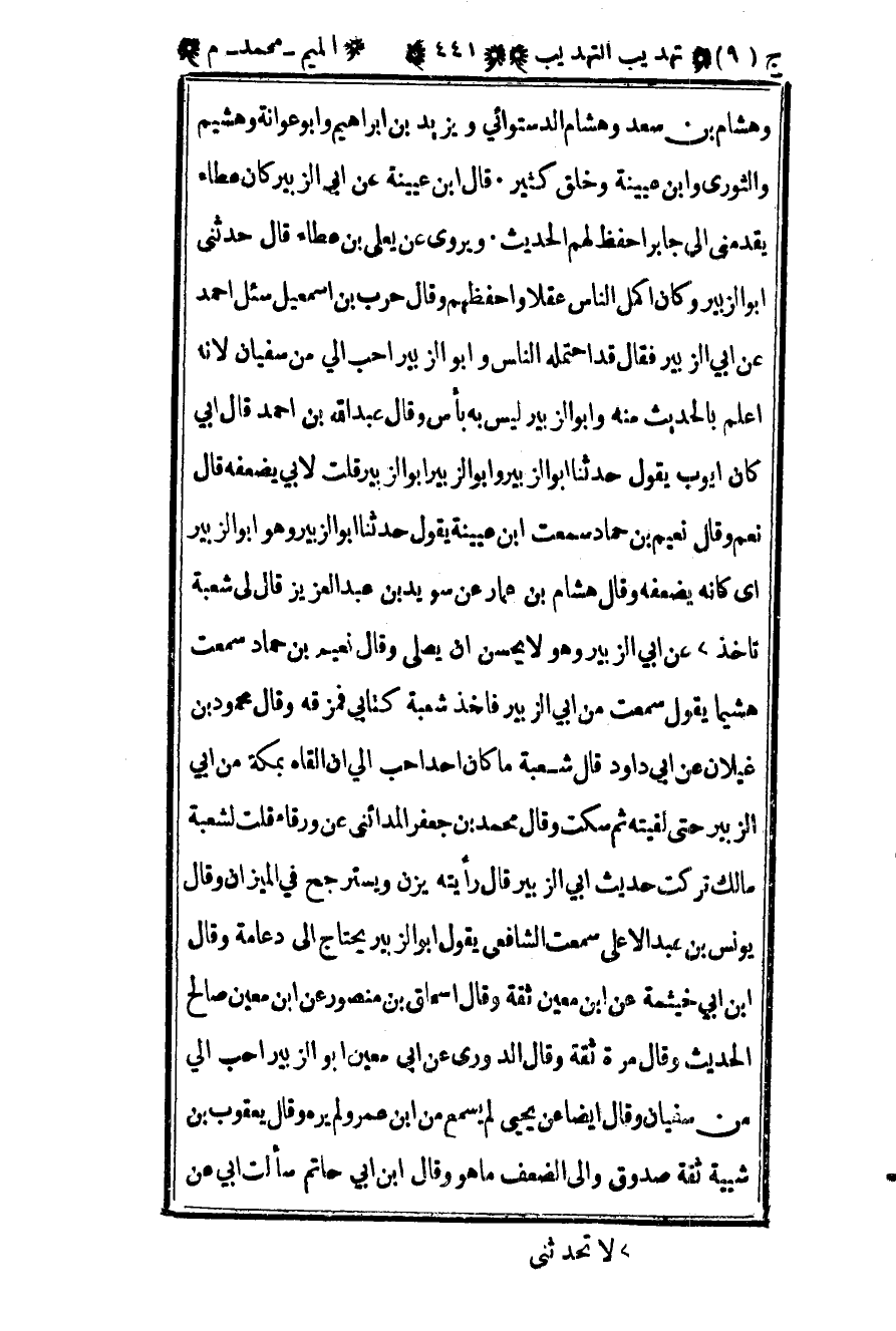 وهشام بن سعد وهشام الدستوائي ويزيد بن إبراهيم وأبو عوانة وهشيم والثوري وابن عيينة وخلق كثير قال بن عيينة عن أبي الزبير كان عطاء يقدمني إلى جابر أحفظ لهم الحديث ويروي عن يعلى بن عطاء قال حدثني أبو الزبير وكان أكمل الناس عقلا وأحفظهم وقال حرب بن إسماعيل سئل أحمد عن أبي الزبير فقال قد احتمله الناس وأبو الزبير أحب إلي من سفيان لأنه أعلم بالحديث منه وأبو الزبير ليس به بأس وقال عبد الله بن أحمد قال أبي كان أيوب يقول حدثنا أبو الزبير وأبو الزبير أبو الزبير قلت لأبي يضعفه قال نعم وقال نعيم بن حماد سمعت بن عيينة يقول حدثنا أبو الزبير وهو أبو الزبير أي كأنه يضعفه وقال هشام بن عمار عن سويد بن عبد العزيز قال لي شعبة تأخذ عن أبي الزبير وهو لا يحسن أن يصلي وقال نعيم بن حماد سمعت هشيما يقول سمعت من أبي الزبير فأخذ شعبة كتابي فمزقه وقال محمود بن غيلان عن أبي داود قال شعبة ما كان أحد أحب إلي أن ألقاه بمكة من أبي الزبير حتى لقيته ثم سكت وقال محمد بن جعفر المدائني عن ورقاء قلت لشعبة مالك تركت حديث أبي الزبير قال رأيته يزن ويسترجح في الميزان وقال يونس بن عبد الأعلى سمعت الشافعي يقول أبو الزبير يحتاج إلى دعامة وقال بن أبي خيثمة عن بن معين ثقة وقال إسحاق بن منصور عن بن معين صالح الحديث وقال مرة ثقة وقال الدوري عن أبي معين أبو الزبير أحب إلي من سفيان وقال أيضا عن يحيى لم يسمع من بن عمر ولم يره وقال يعقوب بن شيبة ثقة صدوق وإلى مضعف ما هو وقال بن أبي حاتم سألت أبي عن