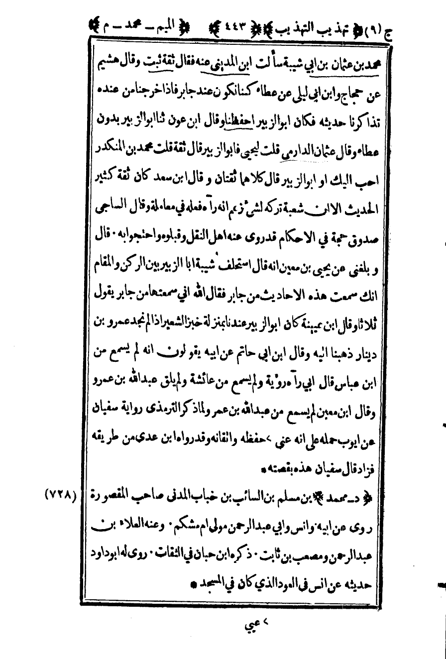 محمد بن عثمان بن أبي شيبة سألت ابن المديني عنه فقال ثقة ثبت وقال هشيم عن حجاج وابن أبي ليلى عن عطاء كنا نكون عند جابر فإذا خرجنا من عنده تذاكرنا حديثه فكان أبو الزبير احفظنا وقال ابن عون ثنا أبو الزبير بدون عطاء وقال عثمان الدارمي قلت ليحيى فأبو الزبير قال ثقة قلت محمد بن المنكدر أحب إليك أو أبو الزبير قال كلاهما ثقتان وقال ابن سعد كان ثقة كثير الحديث إلا أن شعبة تركه لشيء زعم أنه رآه فعله في معاملة وقال الساجي صدوق حجة في الأحكام قد روى عنه أهل النقل وقبلوه واحتجوا به قال وبلغني عن يحيى بن معين أنه قال استحلف شيبه أبا الزبير بين الركن والمقام إنك سمعت هذه الأحاديث من جابر فقال الله إني سمعتها من جابر يقول ثلاثا وقال ابن عيينة كان أبو الزبير عندنا بمنزلة خبز الشعير إذا لم نجد عمرو بن دينار ذهبنا إليه وقال ابن أبي حاتم عن أبيه يقولون أنه لم يسمع من ابن عباس قال أبي رآه رؤية ولم يسمع من عائشة ولم يلق عبد الله بن عمرو وقال ابن معين لم يسمع من عبد الله بن عمرو لما ذكر الترمذي رواية سفيان عن أيوب على أنه عني1 حفظه وإتقانه وقد رواه بن عدي من طريقة فزاد قال سفيان هذه بقصته