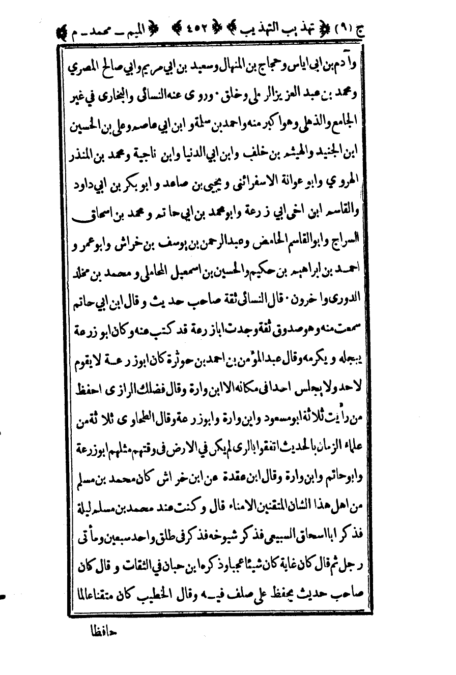وآدم بن أبي إياس وحجاج بن المنهال وسعيد بن أبي مريم وأبي صالح المصري ومحمد بن عبد العزيز الرملي وخلق وروى عنه النسائي والبخاري في غير الجامع والذهلي وهو أكبر منه وأحمد بن سلمة وابن أبي عاصم وعلي بن الحسين بن الجنيد والهيثم بن خلف وابن أبي الدنيا وابن ناجية ومحمد بن المنذر الهروي وأبو عوانة الإسفرائيني ويحيى بن صاعد وأبو بكر بن أبي داود والقاسم بن أخي أبي زرعة وأبو محمد بن أبي حاتم ومحمد بن إسحاق السراج وأبو القاسم الحامض وعبد الرحمن بن يوسف بن خراش وأبو عمرو أحمد بن إبراهيم بن حكيم والحسين بن إسماعيل المحاملي ومحمد بن مخلد الدوري وآخرون قال النسائي ثقة صاحب حديث وقال بن أبي حاتم سمعت منه وهو صدوق ثقة وجدت أبا زرعة قد كتب عنه وكان أبو زرعة يبجله ويكرمه وقال عبد المؤمن بن أحمد بن حوثرة كان أبو زرعة لا يقوم لأحد ولا يجلس أحدا في مكانه إلا بن وارة وقال فضلك الرازي أحفظ من رأيت ثلاثة أبو مسعود وابن وارة وأبو زرعة وقال الطحاوي ثلاثة من علماء الزمان بالحديث اتفقوا بالري لم يكن في الأرض في وقتهم مثلهم أبو زرعة وأبو حاتم وابن وارة وقال بن عقدة عن ابن خراش كان محمد بن مسلم من أهل هذا الشأن المتقنين الأمناء قال وكنت عند محمد بن مسلم ليلة فذكر أبا إسحاق السبيعي فذكر شيوخه فذكر في طلق واحد سبعين ومائتي رجل ثم قال كان غاية كان شيئا عجيبا وذكره ابن حبان في الثقات وقال كان صاحب حديث يحفظ على صلف فيه وقال الخطيب كان متقنا عالما