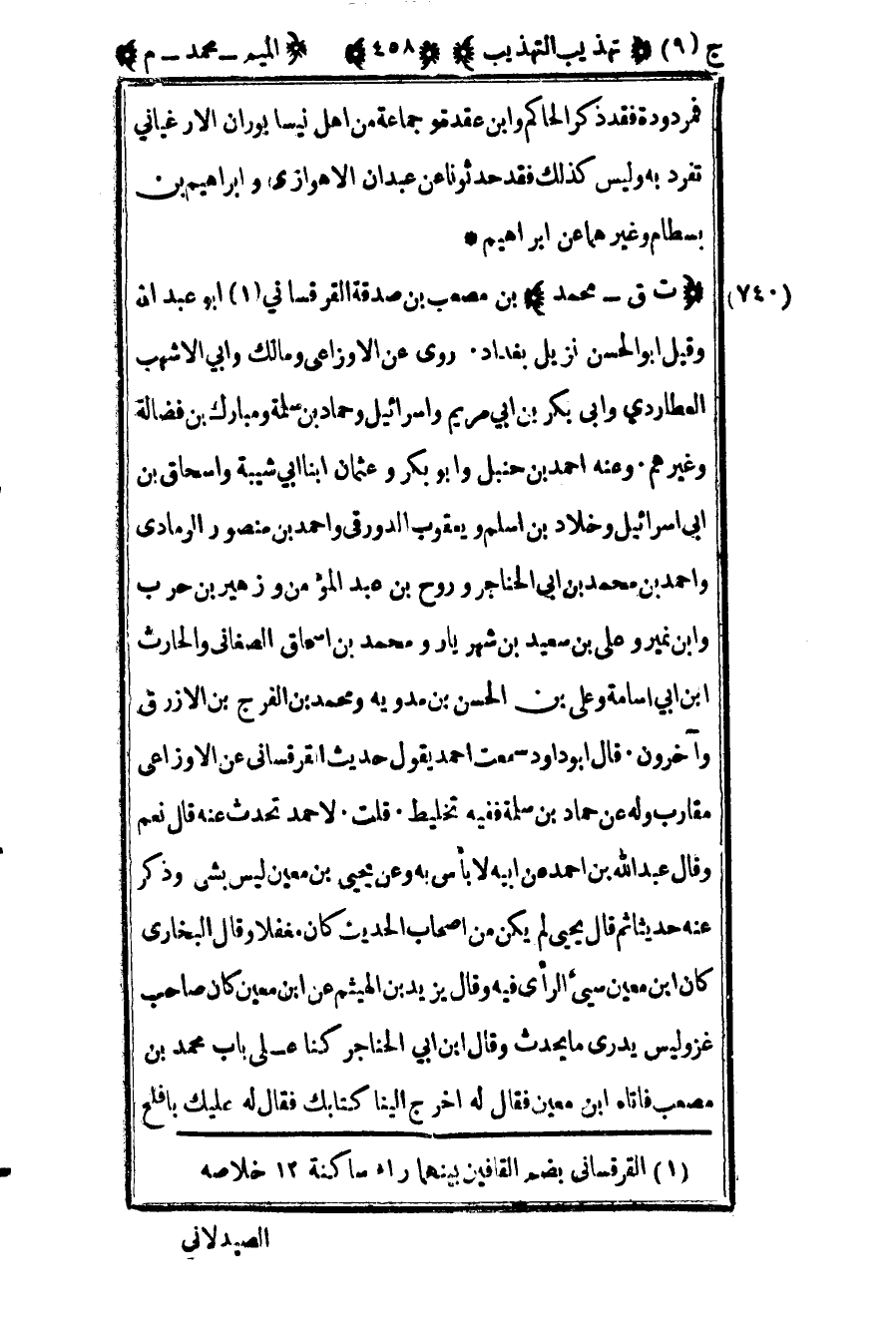 742 – "ت ق – محمد" بن مصعب بن صدقة القرقساني1 أبو عبد الله وقيل أبو الحسن نزيل بغداد روى عن الأوزاعي ومالك وأبي الأشهب العطاردي وأبي بكر بن أبي مريم وإسرائيل وحماد بن سلمة ومبارك بن فضالة وغيرهم وعنه أحمد بن حنبل وأبو بكر وعثمان ابنا شيبة وإسحاق بن أبي إسرائيل وخلاد بن اسلم ويعقوب الدورقي وأحمد بن منصور الرمادي وأحمد بن محمد بن أبي الحناجر وروح بن عبد المؤمن وزهير بن حرب وابن نمير وعلي بن سعيد بن شهريار ومحمد بن إسحاق الصغاني والحارث بن أبي أسامة وعلي بن الحسن بن مدويه ومحمد بن الفرج بن الأزرق وآخرون قال أبو داود سمعت أحمد يقول حديث القرقساني عن الأوزاعي مقارب وله عن حماد بن سلمة ففيه تخليط قلت لأحمد تحدث عنه قال نعم وقال عبد الله بن أحمد عن أبيه لا بأس به وعن يحيى بن معين ليس بشيء وذكر عنه حديثا ثم قال يحيى لم يكن من أصحاب الحديث كان مغفلا وقال البخاري كان بن معين سيء الرأي فيه وقال يزيد بن الهيثم عن بن معين كان صاحب غزو ليس يدري ما يحدث وقال بن أبي الحناجر كنا على باب محمد بن مصعب فأتاه بن معين فقال له أخرج إلينا كتابك فقال له عليك بافلح