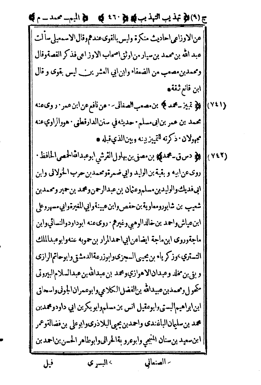 744 – "د س ق – محمد" بن مصفى بن بهلول القرشي أبو عبد الله الحمصي الحافظ روى عن أبيه وبقية بن الوليد وأبي ضمرة ومحمد بن حرب الخولاني وابن أبي فديك والوليد بن مسلم وعثمان بن عبد الرحمن ومحمد بن حمير ومحمد بن شعيب بن شابور ومعاوية بن حفص وابن عيينة وأبي المغيرة وأبي مسهر وعلي بن عياش وأحمد بن خالد الوهبي وغيرهم روى عنه أبو داود والنسائي وابن ماجة وروى بن ماجة أيضا عن أبي أحمد المرار بن حموية عنه وأبو عبد الملك التستري2 وزكرياء بن يحيى السجزي وأبو زرعة الدمشقي وأبو حاتم الرازي وبقي بن مخلد وعبدان الأهوازي ومحمد بن عبد الله بن عبد السلام البيروتي ومكحول ومحمد بن عبيد الله بن الفضل الكلاعي وأبو عمران الجوني وإسحاق بن إبراهيم البستي وأبو عقيل أنس بن مسلم وأبو بكر بن أبي داود ومحمد بن محمد بن سليمان الباغندي وأحمد بن يحيى البلاذري وأبو علي بن فضالة وعمر بن سعيد بن سنان المنبجي وأبو عروبة الحراني وأبو طاهر الحسن بن أحمد بن