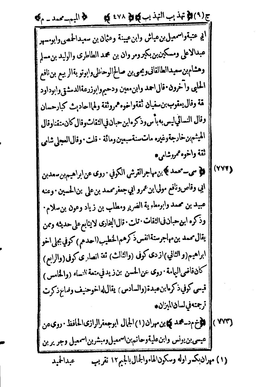 775 – "خ م د – محمد" بن مهران1 الجمال أبو جعفر الرازي الحافظ روى عن عيسى بن يونس وابن علية وحاتم بن إسماعيل ومبشر بن إسماعيل وجرير بن