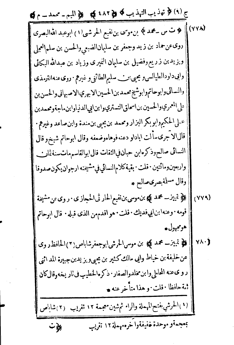 782 – "تمييز – محمد" بن موسى الحرشي أبو جعفر شاباص2 الحافظ روى عن خليفة بن خياط وأبي مالك كثير بن يحيى ويزيد بن جبير المدائني روى عنه المحاملي وابن مخلد والصفار ذكره الخطيب في تاريخه وقال كان ثقة حافظا قلت وهذا متأخر عنه