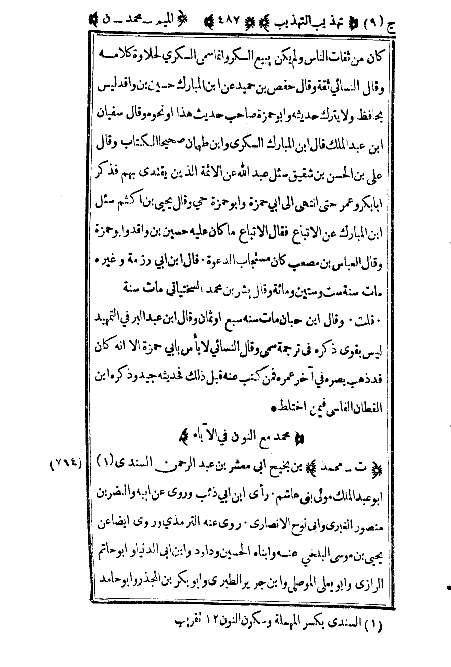 796 – "ت – محمد" بن نجيح أبي معشر بن عبد الرحمن السندي1 أبو عبد الملك مولى بني هاشم رأى بن أبي ذئب وروى عن أبيه بن منصور الغبري وأبو نوح الأنصاري روى عنه الترمذي وروى أيضا عن يحيى بن موسى البلخي عنه وابناه الحسين وداود بن أبي الدنيا وأبو حاتم الرازي وأبو يعلى الموصلي وابن جرير الطبري وأبو بكر بن المجذر وأبو حامد