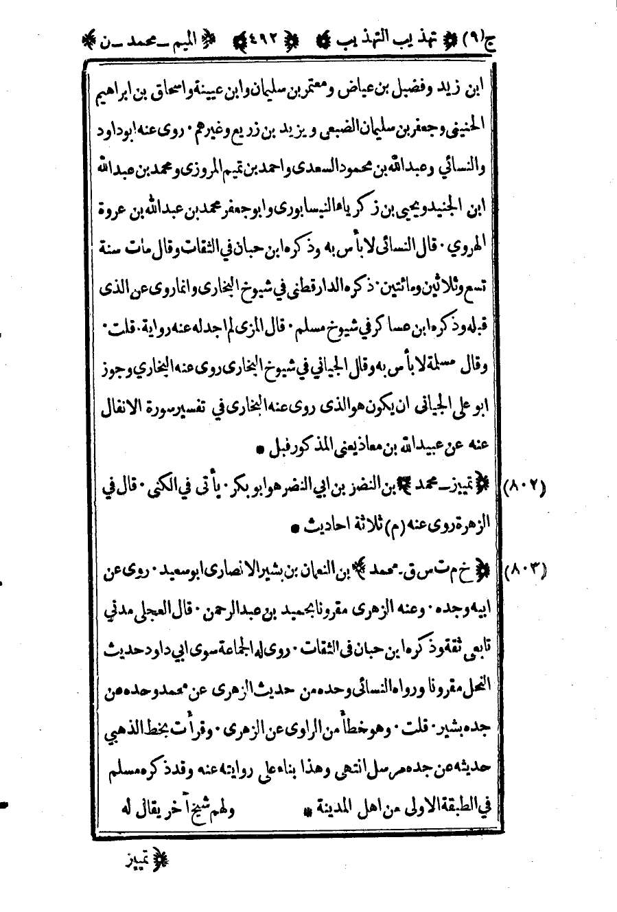 804 – "تمييز – محمد" بن النضر بن أبي النضر هو أبو بكر يأتي في الكنى قال في الزهرة روى عنه م ثلاثة أحاديث