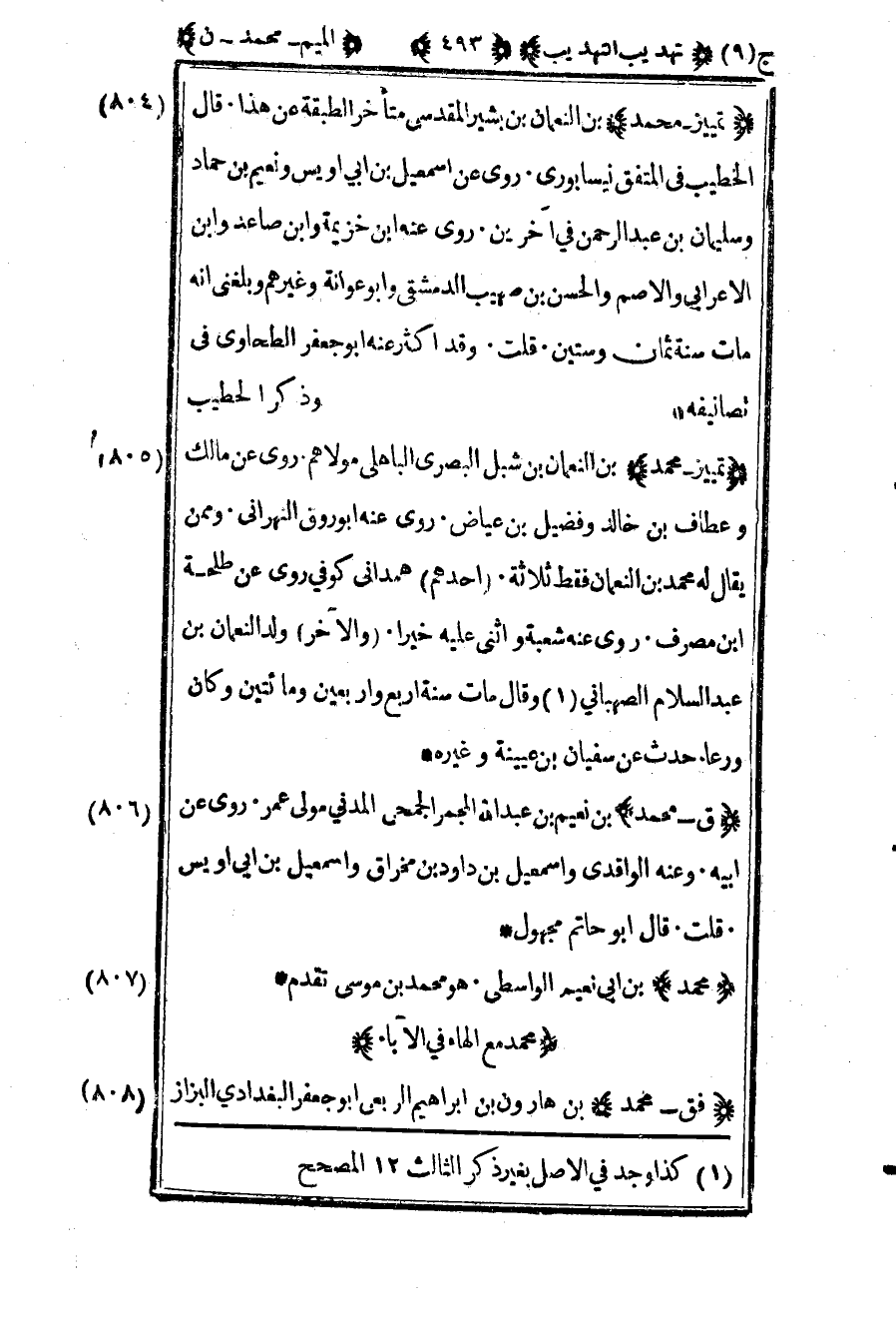 807 – "تمييز – محمد" بن النعمان بن شبل البصري الباهلي مولاهم روى عن مالك وعطاف بن خالد وفضيل بن عياض روى عنه أبو روق النهراني وممن يقال له محمد بن النعمان فقط ثلاثة أحدهم همداني كوفي روى عن طلحة بن مصرف روى عنه شعبة وأثنى عليه خيرا ولآخر ولد النعمان بن عبد السلام الصهباني1 وقال مات سنة أربع وأربعين ومائتين وكان ورعا حدث عن سفيان بن عيينة وغيره