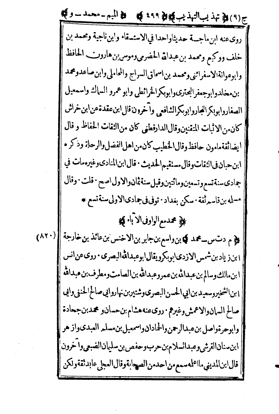 822 – " م د ت س – محمد" بن واسع بن جابر بن الأخنس بن عائذ بن خارجة بن زياد بن شمس الأزدي أبو بكر ويقال أبو عبد الله البصري روى عن أنس بن مالك وسالم بن عبد الله بن عمر وعبد الله بن الصامت ومطرف بن عبد الله بن الشخير وسعيد بن أبي الحسن البصري وشتير بن نهار وأبي صالح الحنفي وأبي صالح السمان والأعمش وغيرهم روى عنه هشام بن حسان ومحمد بن جحادة وأبو حرة واصل بن عبد الرحمن والحمادان وإسماعيل بن مسلم العبدي وأزهر بن سنان القرشي وعبد السلام بن حزب وحفص بن سليمان الضبعي وآخرون قال بن المديني ما أعلمه سمع من أحد من الصحابة وقال العجلي عابد ثقة ولكن