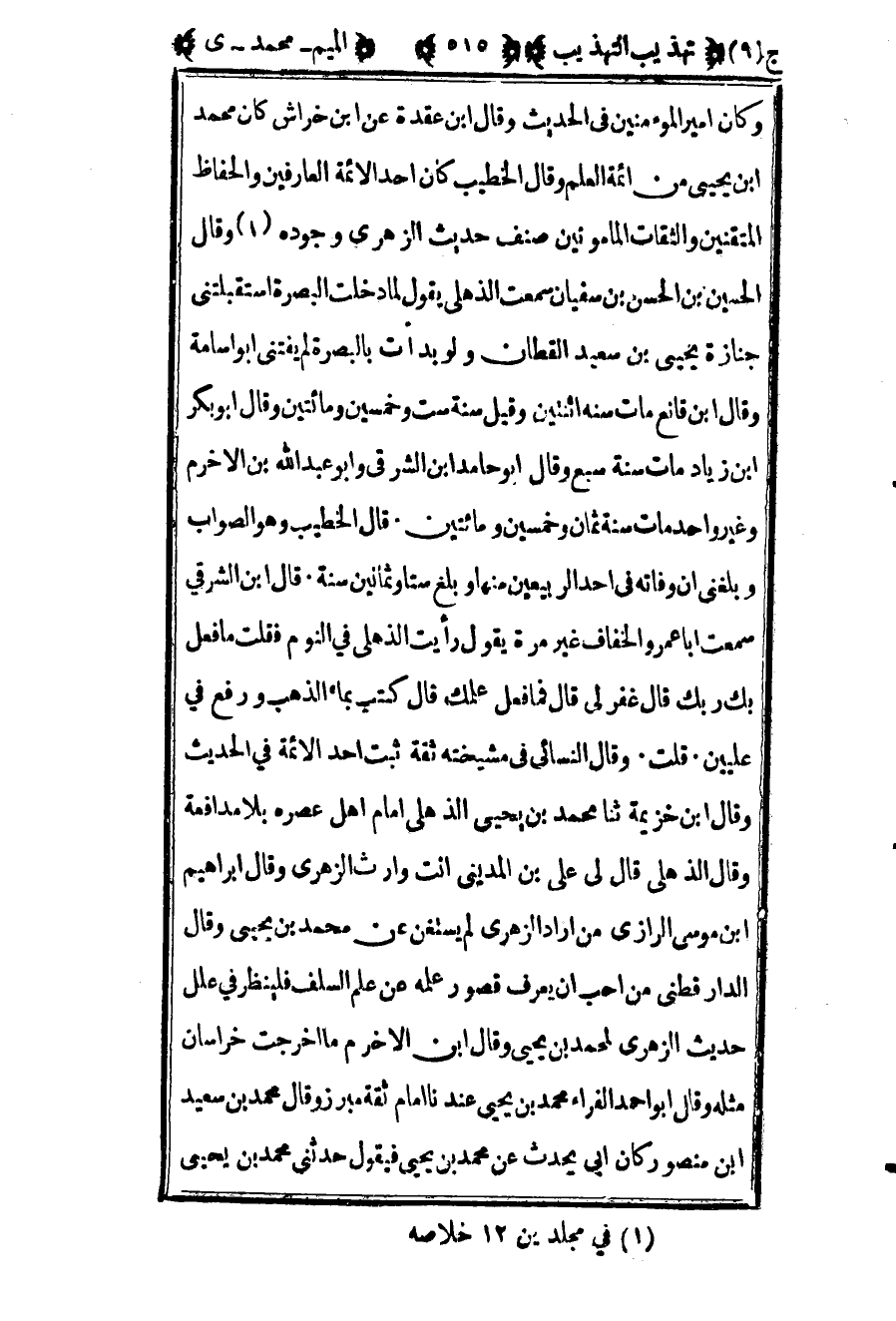 وكان أمير المؤمنين في الحديث وقال بن عقدة عن ابن خراش كان محمد بن يحيى من أئمة العلم وقال الخطيب كان أحد الأئمة العارفين والحفاظ المتقنين والثقات المأمونين صنف حديث الزهري وجوده1 وقال الحسين بن الحسن بن سفيان سمعت الذهلي يقول لما دخلت البصرة استقبلتني جنازة يحيى بن سعيد القطان ولو بدأت بالبصرة لم يفتني أبو أسامة وقال بن قانع مات سنة اثنتين وقيل سنة ست وخمسين ومائتين وقال أبو بكر بن زياد مات سنة سبع وقال أبو حامد بن الشرقي وأبو عبد الله بن الأخرم وغير واحد مات سنة ثمان وخمسين ومائتين قال الخطيب وهو الصواب وبلغني أن وفاته في أحد الربيعين منها وبلغ ستا وثمانين سنة قال ابن الشرقي سمعت أبا عمرو الخفاف غير مرة يقول رأيت الذهلي في النوم فقلت ما فعل بك ربك قال غفر لي قال فما فعل علمك قال كتب بماء الذهب ورفع في عليين قلت وقال النسائي في مشيخته ثقة ثبت أحد الأئمة في الحديث وقال بن خزيمة ثنا محمد بن يحيى الذهلي إمام أهل عصره بلا مدافعة وقال الذهلي قال لي علي بن المديني أنت وارث الزهري وقال إبراهيم بن موسى الرازي من أراد الزهري لم يستغن عن محمد بن يحيى وقال الدارقطني من أحب أن يعرف قصور علمه عن علم السلف فلينظر في علل حديث الزهري لمحمد بن يحيى وقال بن الأخرم ما أخرجت خراسانة مثله وقال أبو أحمد الفراء محمد بن يحيى عندنا إمام ثقة مبرز وقال محمد بن سعيد بن منصور كان أبي يحدث عن محمد بن يحيى فيقول حدثني محمد بن يحيى