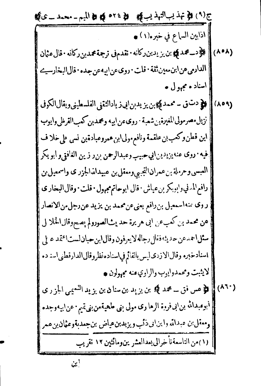 860 – "د – محمد" بن يزيد بن ركانة تقدم في ترجمة محمد بن ركانة قال عثمان الدارمي عن بن معين ثقة قلت روى عن أبيه عن جده قال البخاري إسناده مجهول