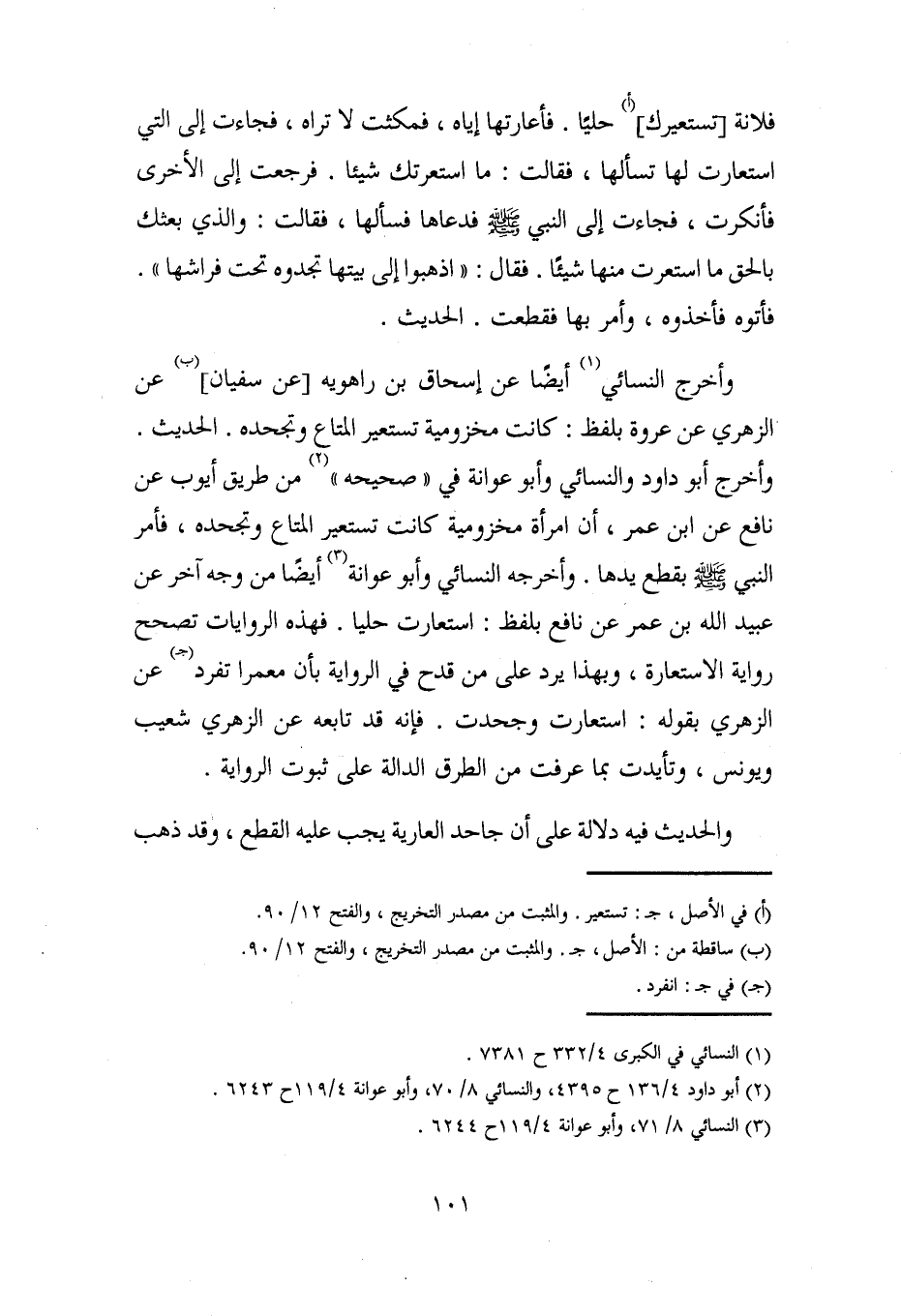 فلانة، [تستعيرك] (أ) حليًّا. فأعارتها إياه، فمكثت لا تراه، فجاءت إلى التي استعارت لها تسألها، فقالت: ما استعرتك شيئًا. فرجعت إلى الأخرى فأنكرت، فجاءت إلى النبي - صلى الله عليه وسلم - فدعاها فسألها، فقالت: والذي بعثك بالحق ما استعرت منها شيئًا. فقال: "اذهبوا إلى بيتها تجدوه تحت فراشها". فأتوه فأخذوه، وأمر بها فقطعت. الحديث.