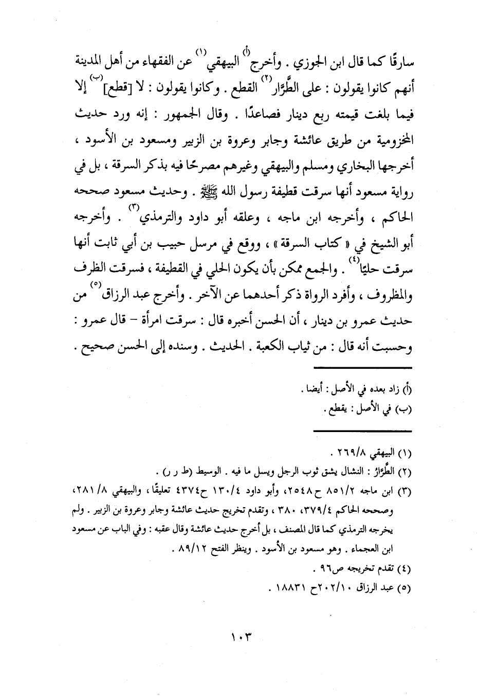 سارقًا كما قال ابن الجوزي. وأخرج (أ) البيهقي (¬1) عن الفقهاء من أهل المدينة أنهم كانوا يقولون: على الطَّرَّار (¬2) القطع. وكانوا يقولون: لا [قطع] (ب) إلا فيما بلغت قيمته ربع دينار فصاعدًا. وقال الجمهور: إنه ورد حديث المخزومية من طريق عائشة وجابر وعروة بن الزبير ومسعود بن الأسود، أخرجها البخاري ومسلم والبيهقي وغيرهم مصرحًا فيه بذكر السرقة، بل في رواية مسعود أنها سرقت قطفة رسول الله - صلى الله عليه وسلم -. وحديث مسعود صححه الحاكم، وأخرجه ابن ماجه، وعلقه أبو داود والترمذي (¬3). وأخرجه أبو الشيخ في "كتاب السرقة"، ووقع في مرسل حبيب بن أبي ثابت أنها سرقت حليًّا (¬4). والجمع ممكن بأن يكون الحلي في القطيفة، فسرقت الظرف والمظروف، وأفرد الرواة ذكر أحدهما عن الآخر. وأخرج عبد الرزاق (¬5) من حديث عمرو بن دينار، أن الحسن أخبره قال: سرقت امرأة -قال عمرو: وحسبت أنه قال: من ثياب الكعبة. الحديث. وسنده إلى الحسن صحيح.