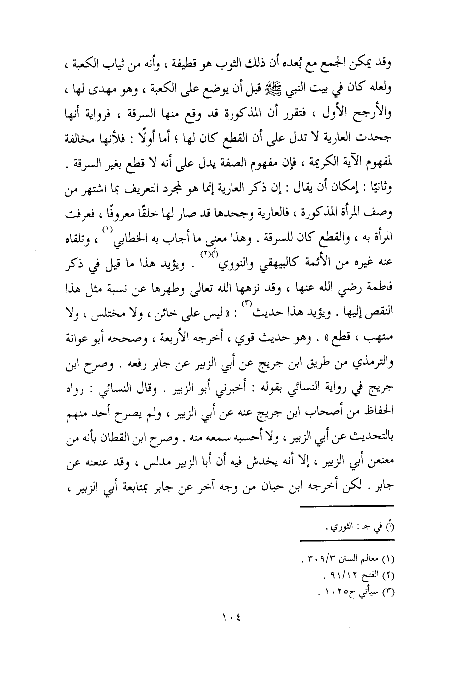 وقد يمكن الجمع مع بُعده أن ذلك الثوب هو قطيفة، وأنه من ثياب الكعبة، ولعله كان في بيت النبي - صلى الله عليه وسلم - قبل أن يوضع على الكعبة، وهو مهدى لها، والأرجح الأول، فتقرر أن المذكورة قد وقع منها السرقة، فرواية أنها جحدت العارية لا تدل على أن القطع كان لها؛ أما أولًا: فلأنها مخالفة لمفهوم الآية الكريمة، فإن مفهوم الصفة يدل على أنه لا قطع بغير السرقة. وثانيًا: إمكان أن يقال: إن ذكر العارية إنما هو لمجرد التعريف بما اشتهر من وصف المرأة المذكورة، فالعارية وجحدها قد صار لها خلقًا معروفًا، فعرفت المرأة به، والقطع كان للسرقة. وهذا معنى ما أجاب به الخطابي (¬1)، وتلقاه عنه غيره من الأئمة كالبيهقي والنووي (أ) (¬2). ويؤيد هذا ما قيل في ذكر فاطمة رضي الله عنها، وقد نزهها الله تعالى وطهرها عن نسبة مثل هذا النقص إليها. ويؤيد هذا حديث (¬3): "ليس على خائن، ولا مختلس، ولا منتهب، قطع". وهو حديث قوي، أخرجه الأربعة، وصححه أبو عوانة والترمذي من طريق ابن جريج عن أبي الزبير عن جابر رفعه. وصرح ابن جريج في رواية النسائي بقوله: أخبرني أبو الزبير. وقال النسائي: رراه الحفاظ من أصحاب ابن جريج عنه عن أبي الزبير، ولم يصرح أحد منهم بالتحديث عن أبي الزبير، في لا أحسبه سمعه منه. وصرح ابن القطان بأنه من معنعن أبي الزبير، إلا أنه يخدش فيه أن أبا الزبير مدلس، وقد عنعنه عن جابر. لكن أخرجه ابن حبان من وجه آخر عن جابر بمتابعة أبي الزبير،
