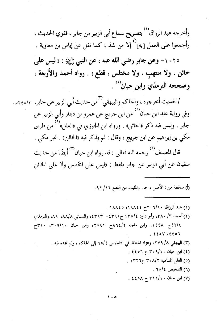 1025 - وعن جابر رضي الله عنه، عن النبي - صلى الله عليه وسلم -: "ليس على خائن، ولا منتهبٍ، ولا مختلس، قطع". رواه أحمد والأربعة، وصححه الترمذي وابن حبان (¬2).
