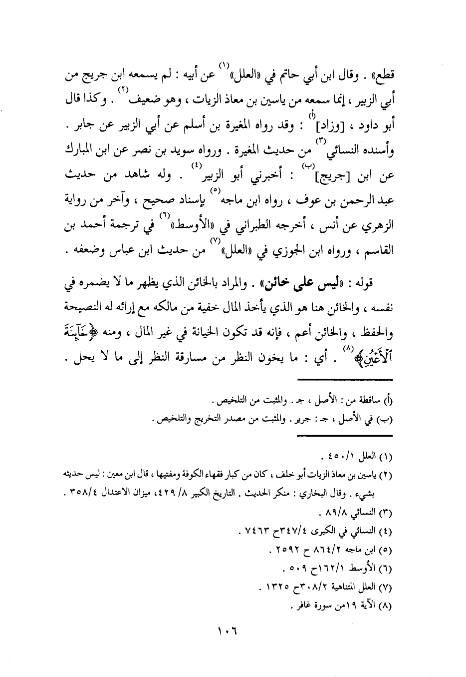 (¬2) ياسين بن معاذ الزيات أبو خلف، كان من كبار فقهاء الكوفة ومفتيها، قال ابن معين: ليس حديثه بشيء. وقال البخاري: منكر الحديث. التاريخ الكبير 8/ 429، ميزان الاعتدال 4/ 358.