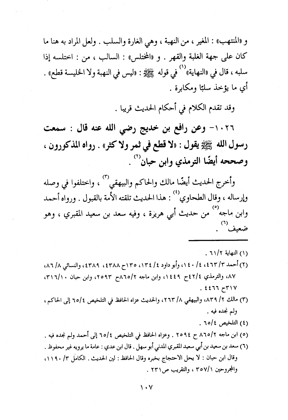 1026 - وعن رافع بن خديج رضي الله عنه قال: سمعت رسول الله - صلى الله عليه وسلم - يقول: "لا قطع في ثمر ولا أكثر". رواه المذكورون، وصححه أيضًا الترمذي وابن حبان (¬2).